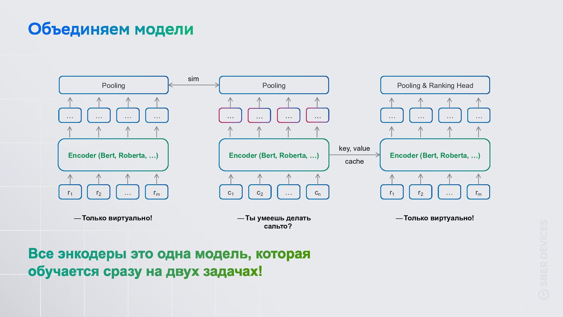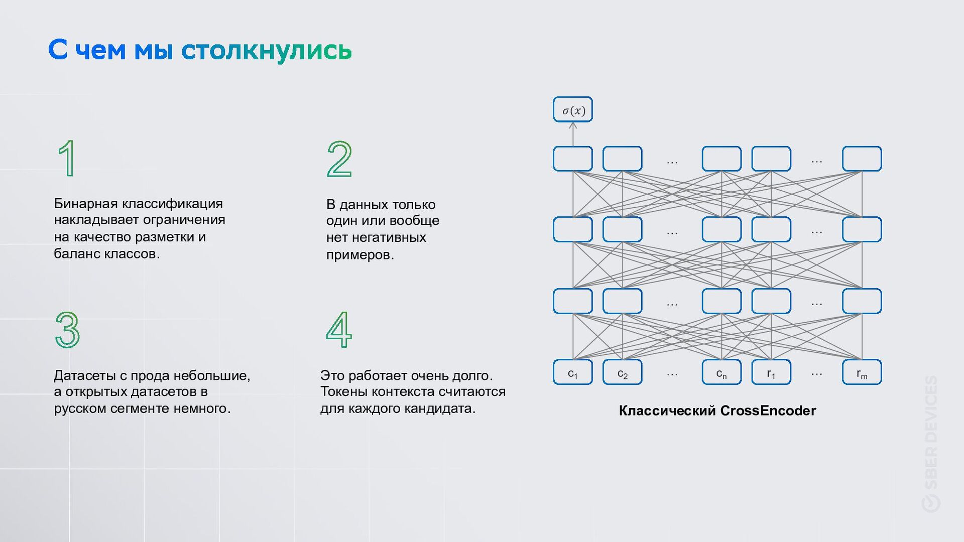 Датасеты с прода небольшие, а открытых датасетов в русском сегменте немного. В данных только один или вообще нет негативных примеров. Это работает очень долго. Токены контекста считаются для каждого кандидата. с1 с2 сn r1 rm 𝜎(𝑥) … … … … … … … … Классический CrossEncoder