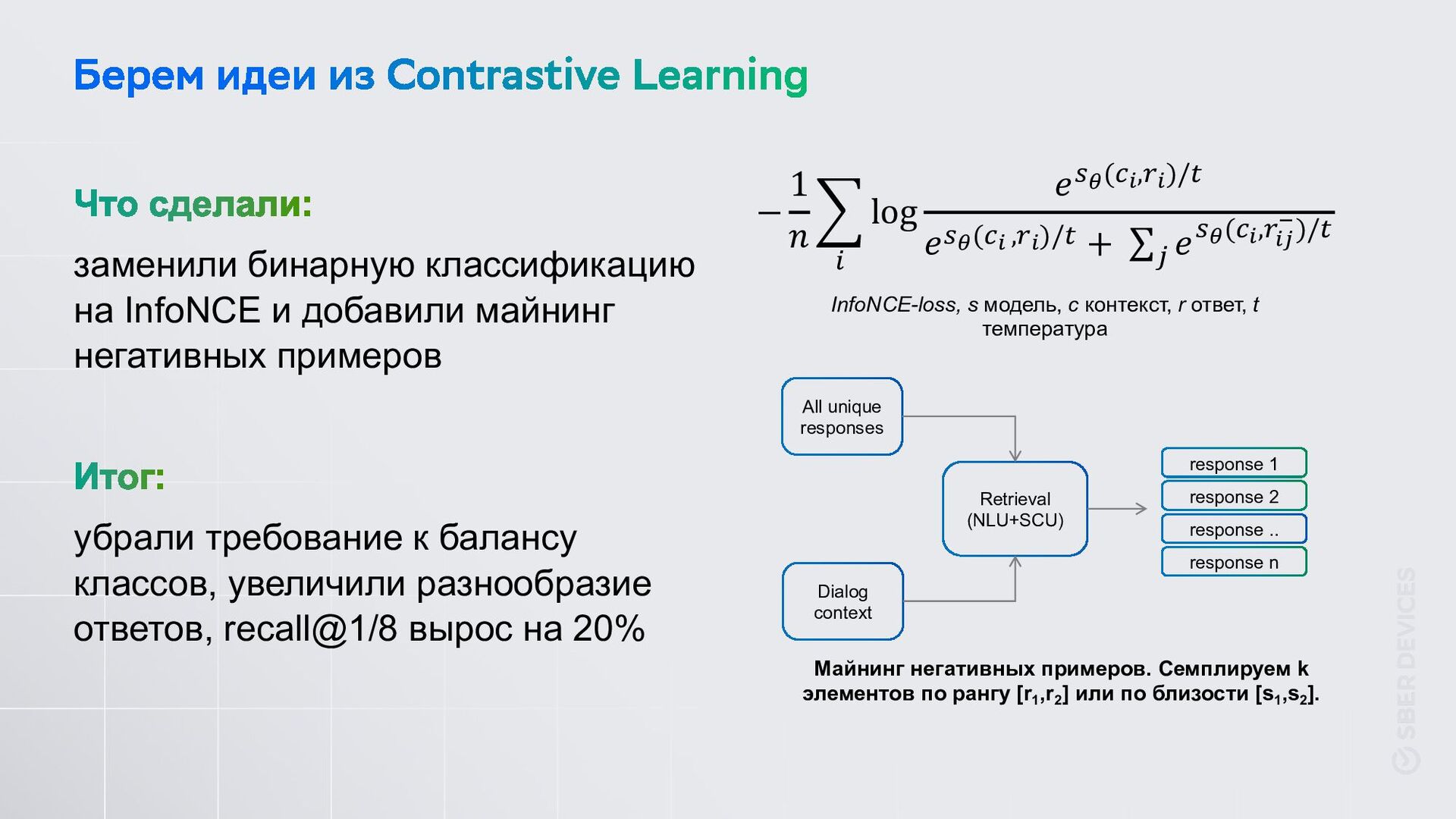 убрали требование к балансу классов, увеличили разнообразие ответов, recall@1/8 вырос на 20% − 1 𝑛 $ ! log 𝑒"!($",&")/) 𝑒"!($" ,&")/) + ∑* 𝑒"!($",&"# $)/) InfoNCE-loss, s модель, c контекст, r ответ, t температура All unique responses Retrieval (NLU+SCU) Dialog context response 1 response 2 response .. response n Майнинг негативных примеров. Семплируем k элементов по рангу [r1 ,r2 ] или по близости [s1 ,s2 ].