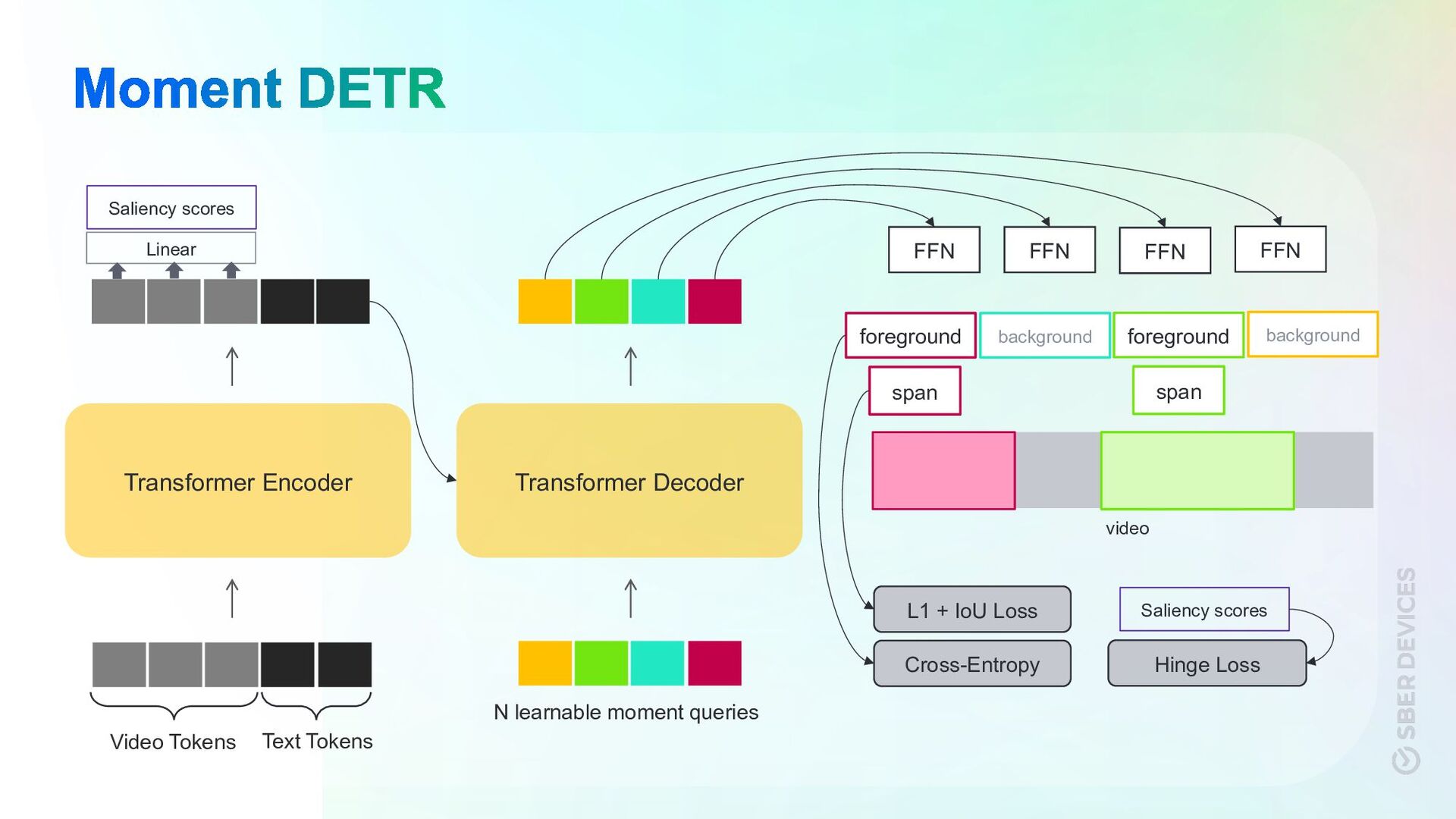foreground background span span L1 + IoU Loss Cross-Entropy Hinge Loss Saliency scores Saliency scores Linear video Video Tokens Text Tokens N learnable moment queries