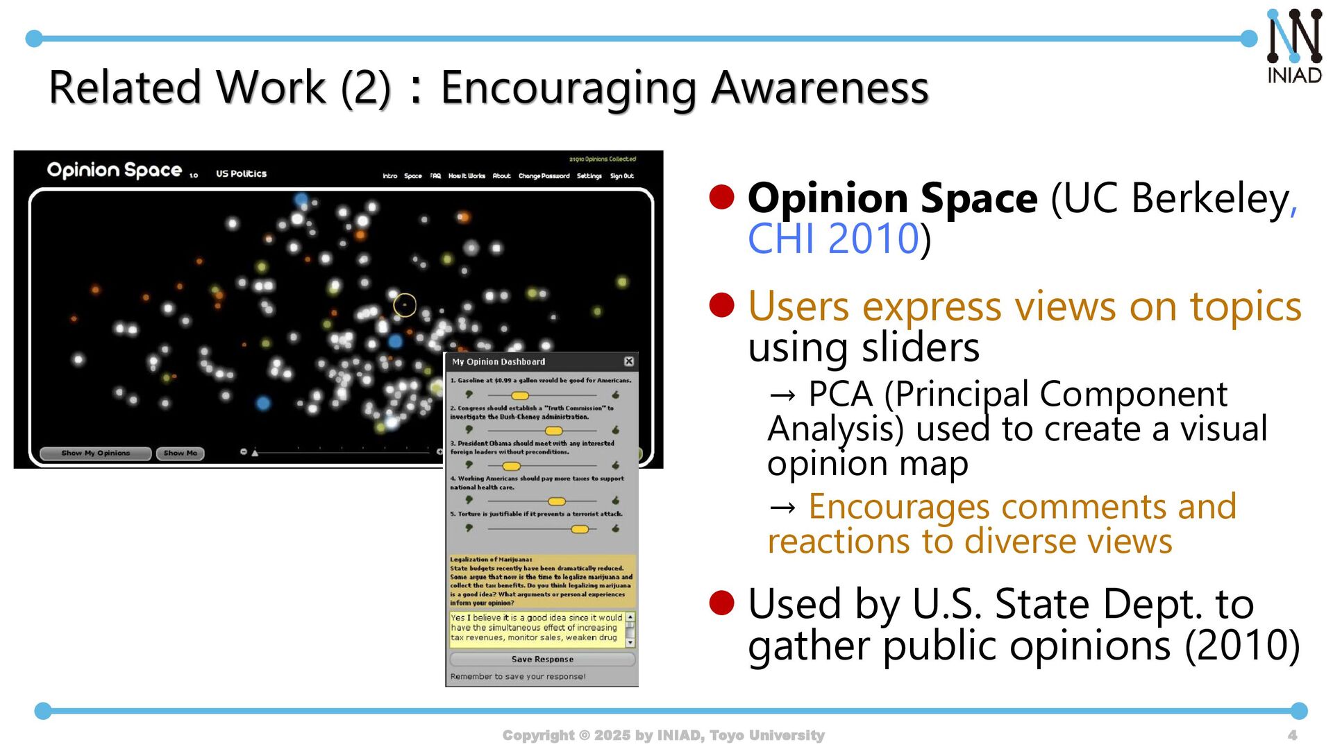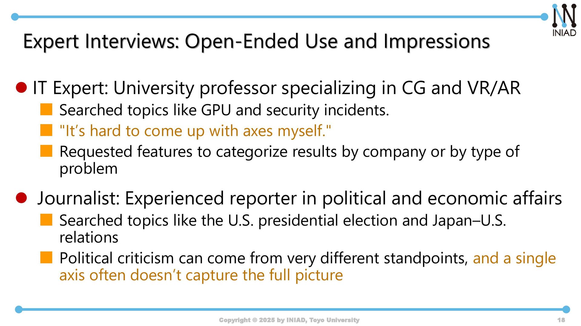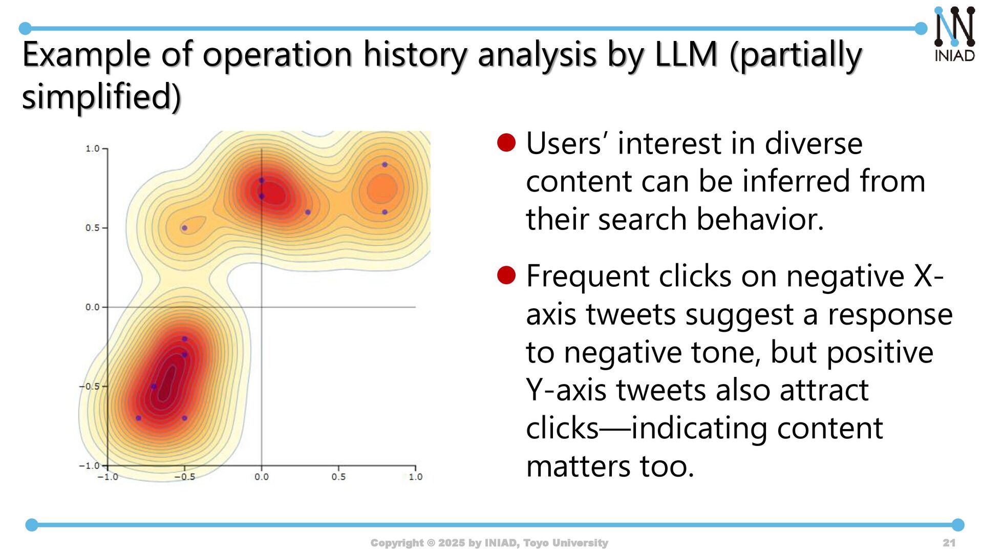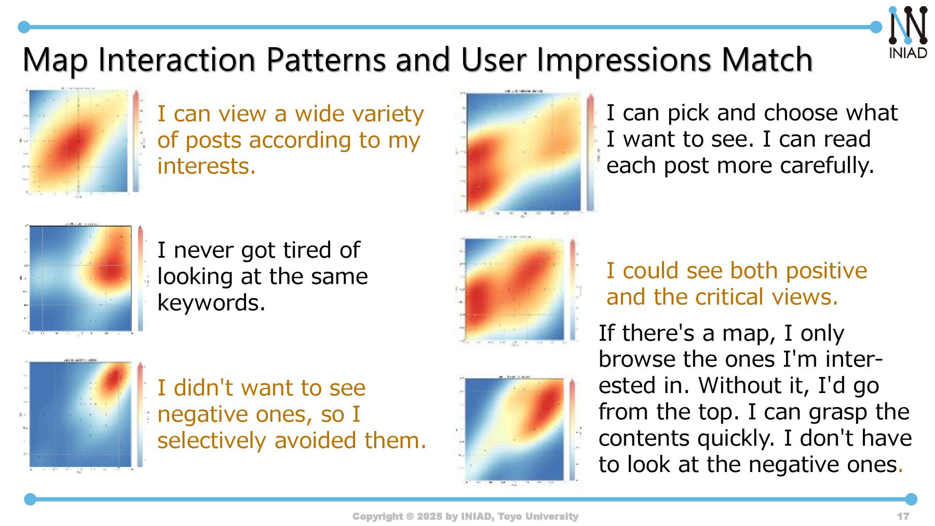 by INIAD, Toyo University 17 I can view a wide variety of posts according to my interests. I didn't want to see negative ones, so I selectively avoided them. If there's a map, I only browse the ones I'm inter- ested in. Without it, I'd go from the top. I can grasp the contents quickly. I don't have to look at the negative ones. I can pick and choose what I want to see. I can read each post more carefully. I never got tired of looking at the same keywords. I could see both positive and the critical views.