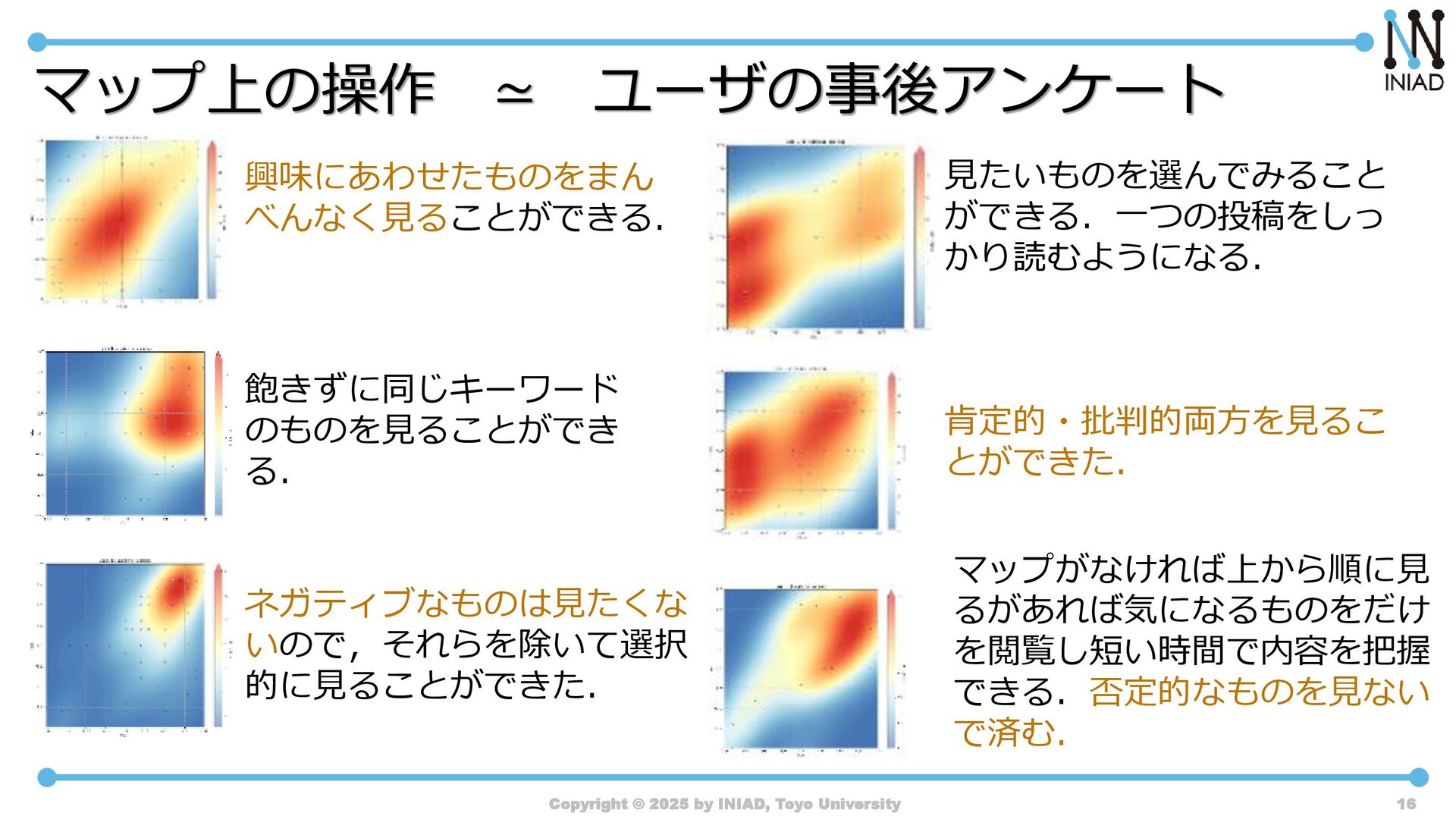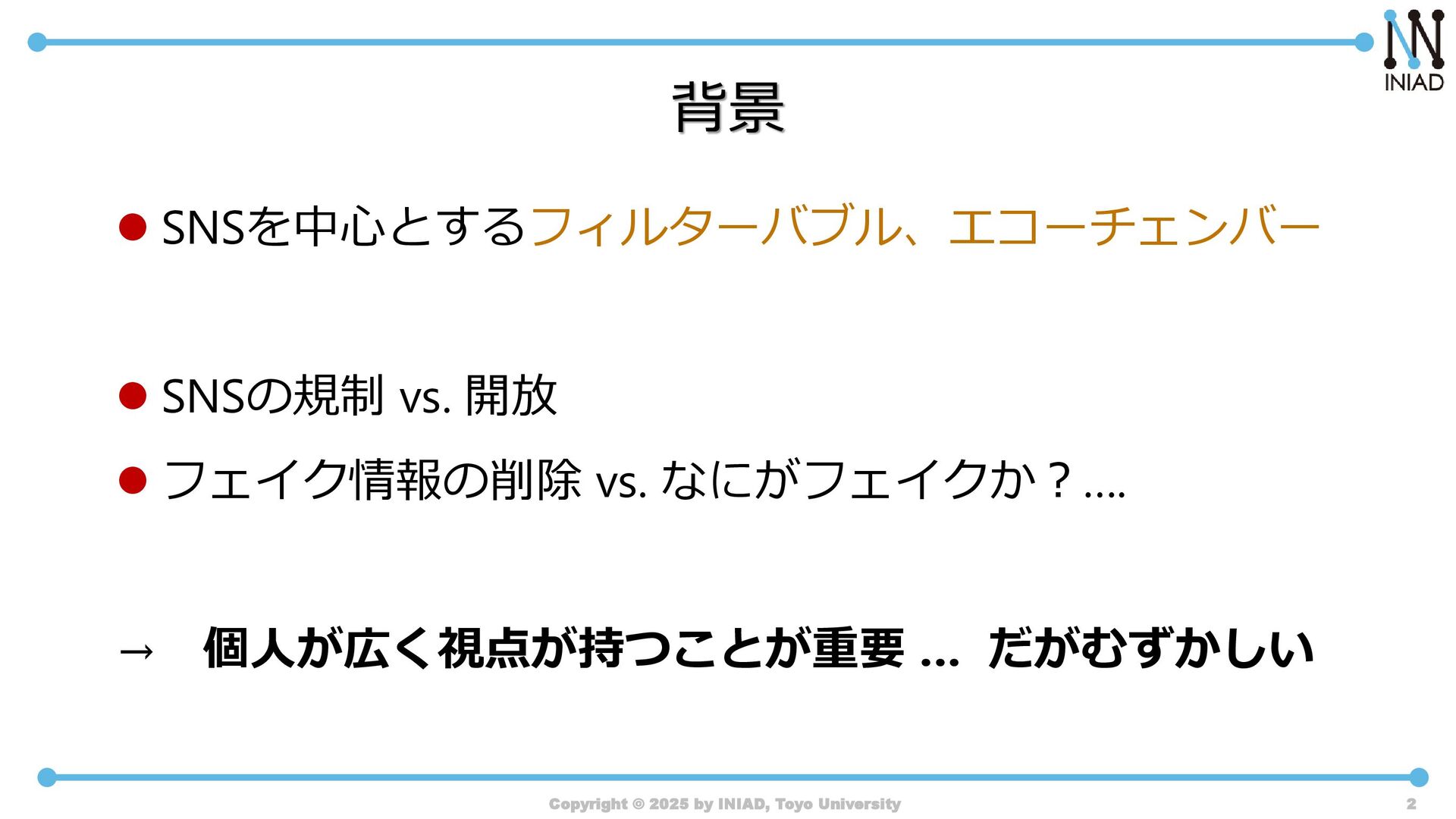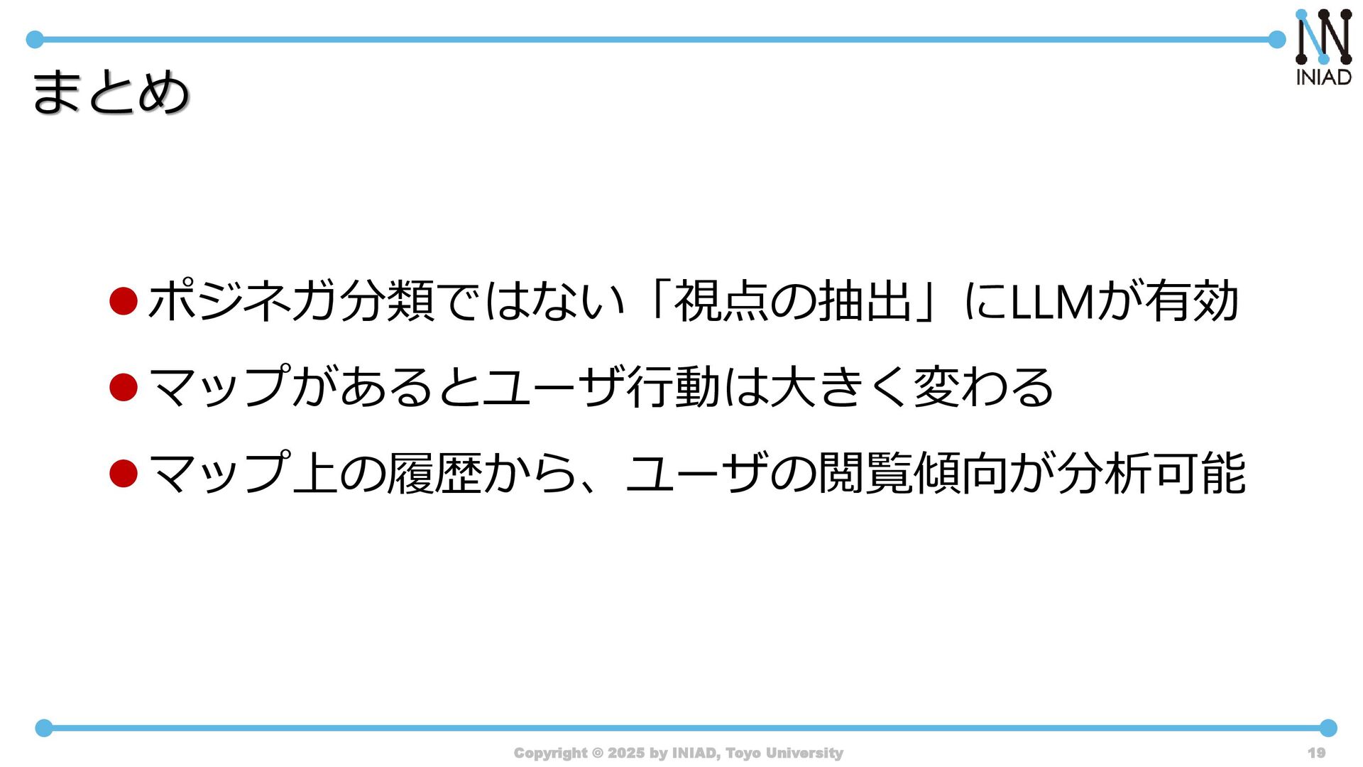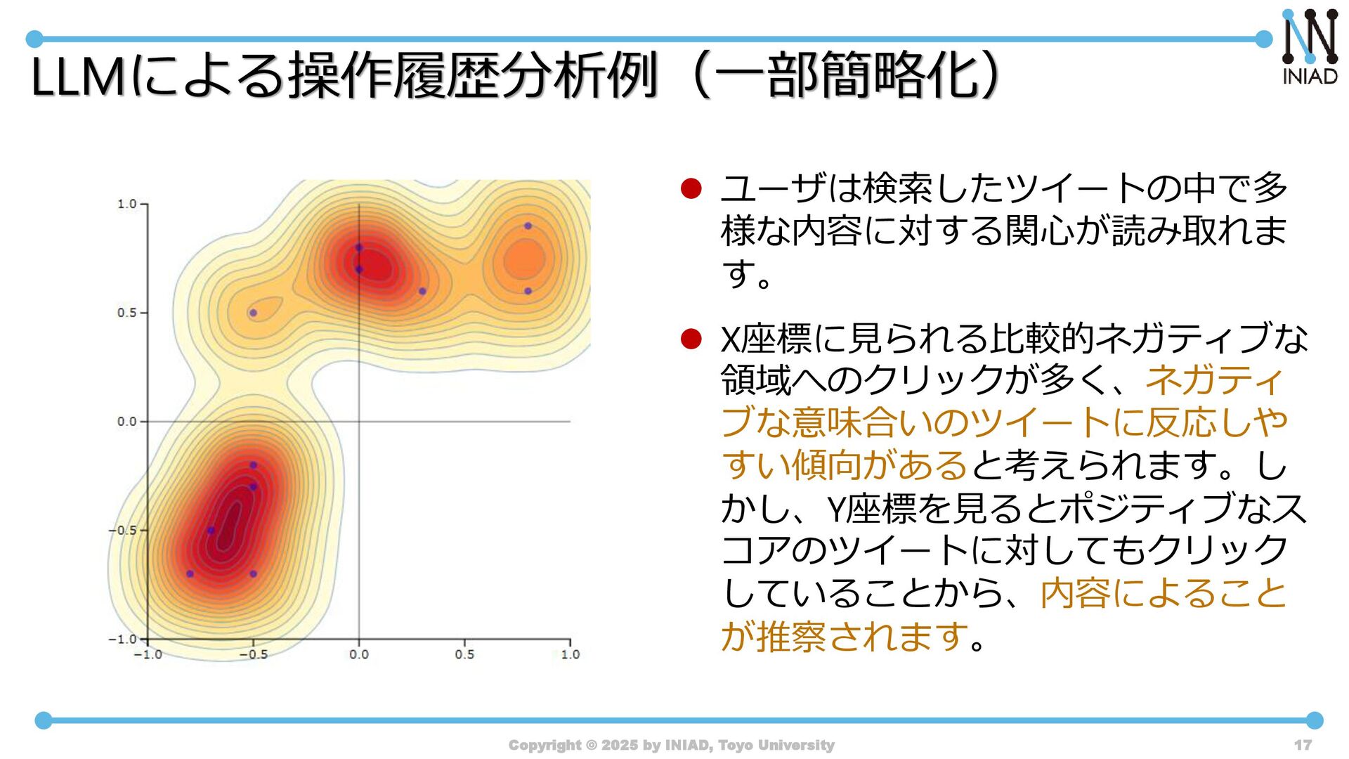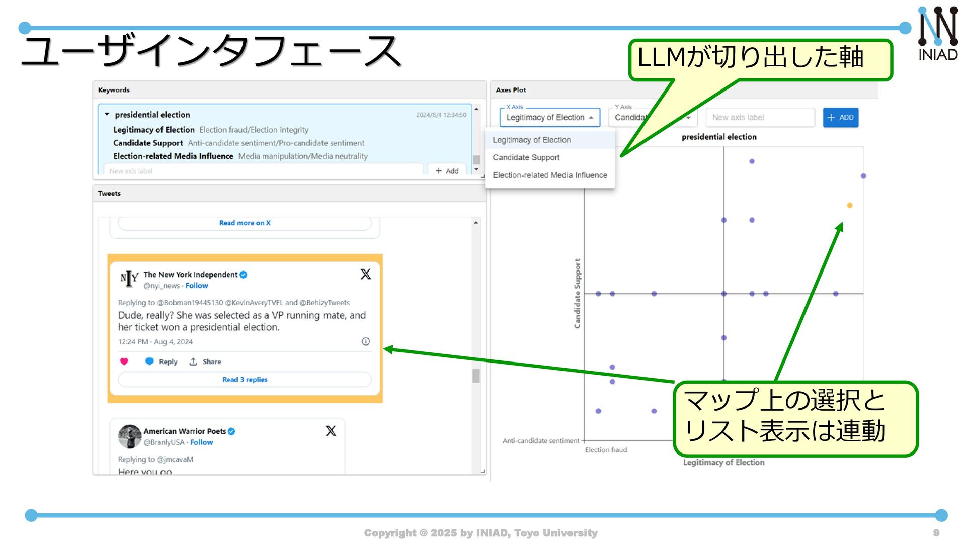 SNSの検索結果を、複数の視点から見る対話側ポジショニングマップで提示する。視点の切り出しやマッピングは、大規模言語モデル(LLM)を利用している。 フィルターバブルの軽減に向け、さまざまな視点をユーザに提供することを目的とする。