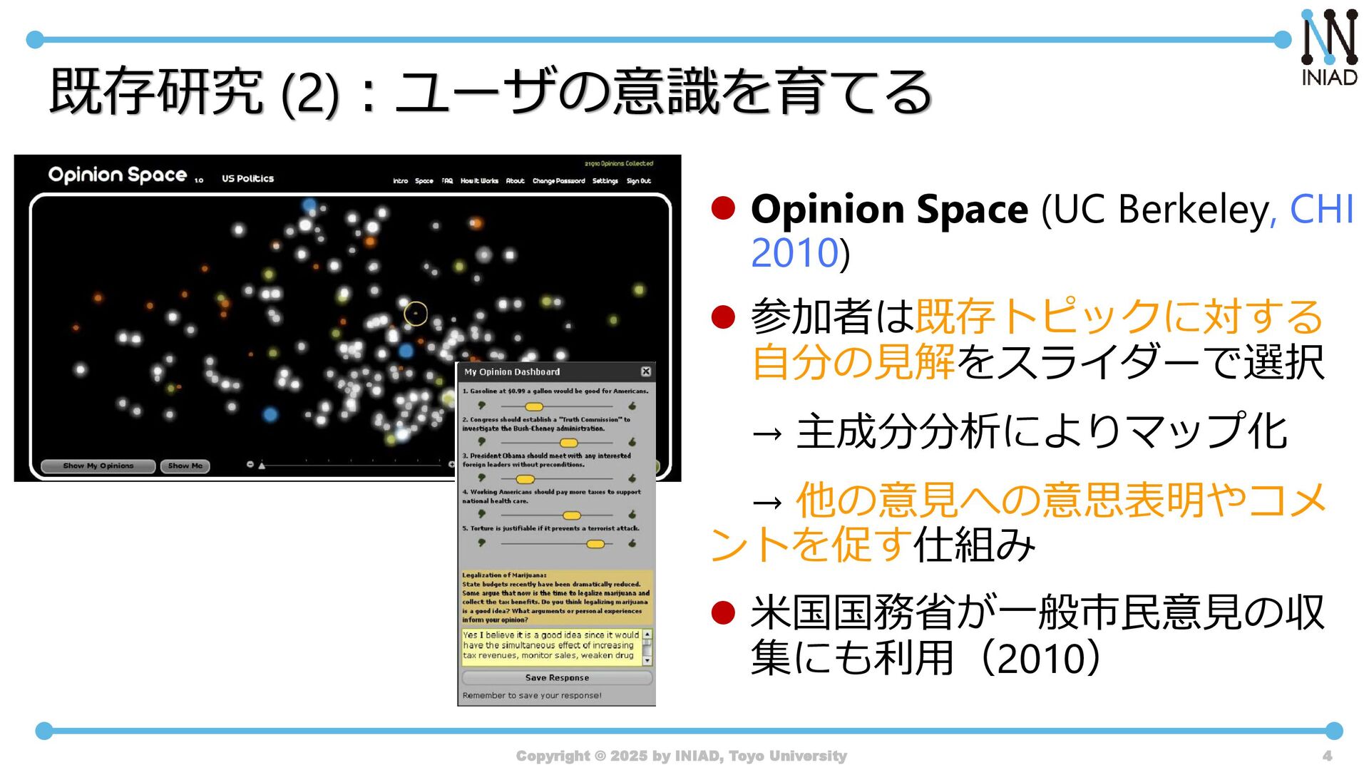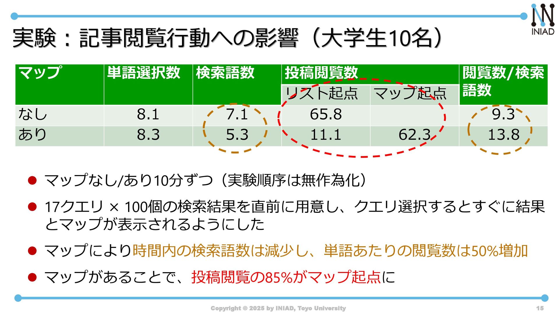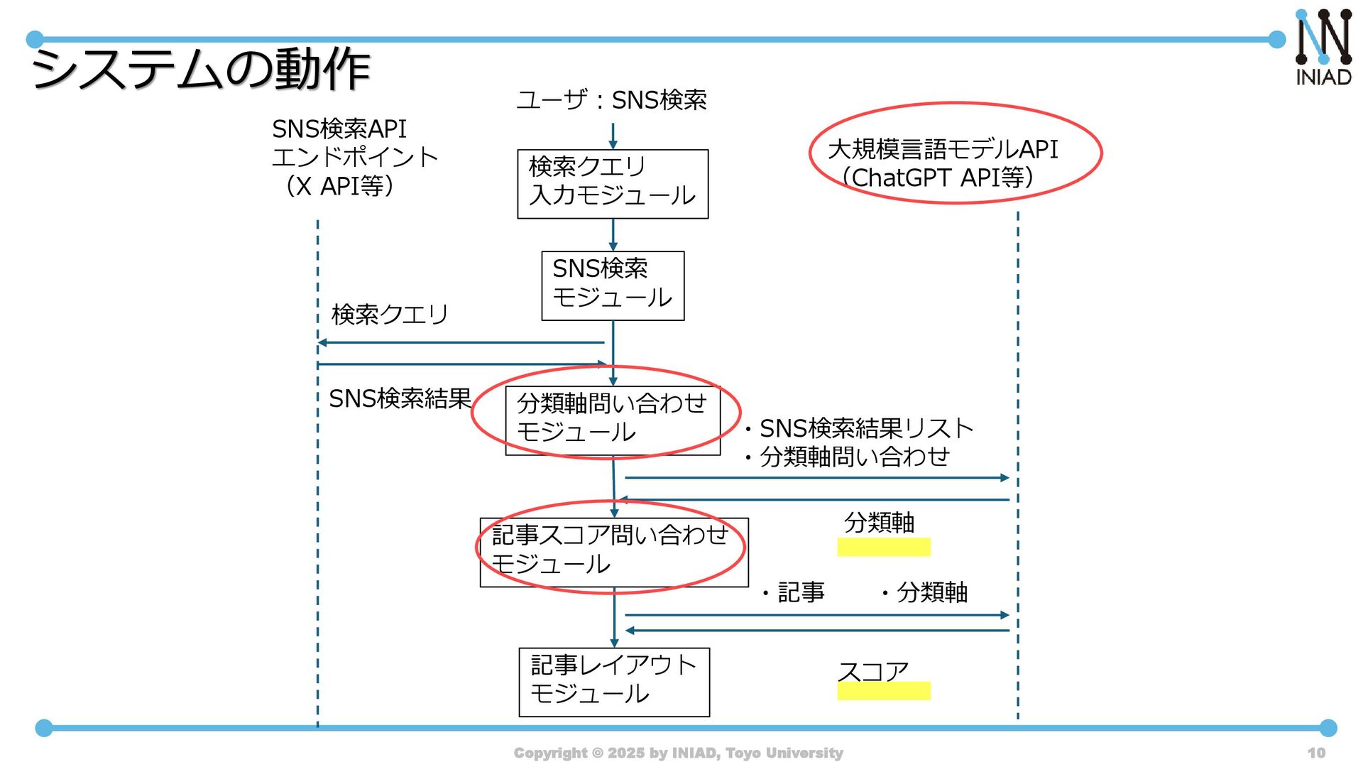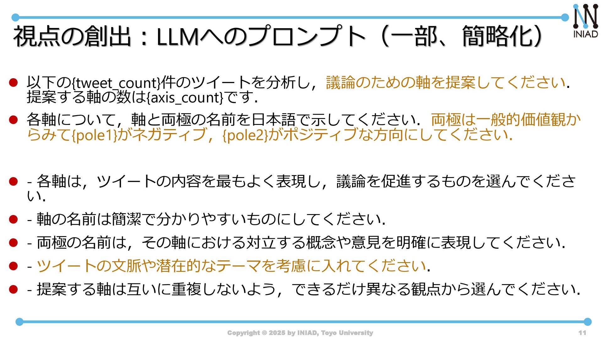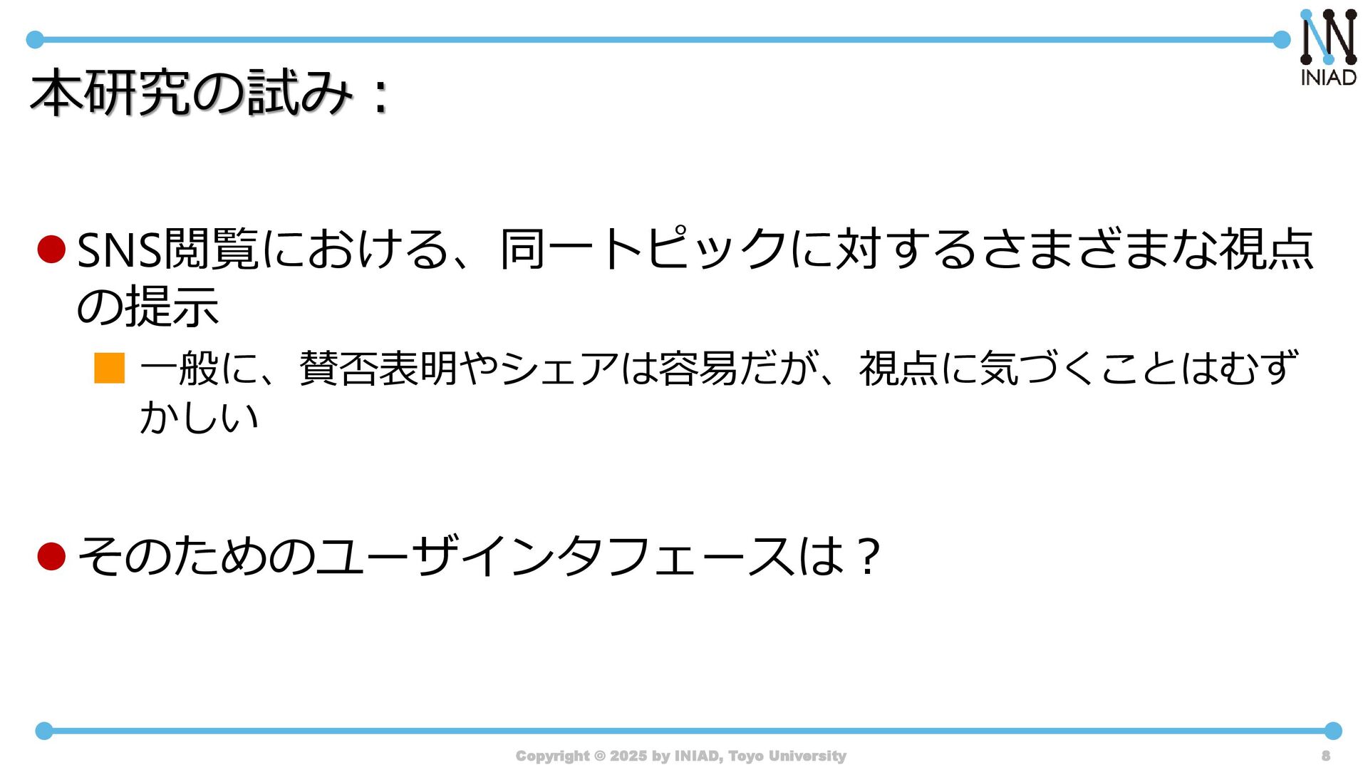 SNSの検索結果を、複数の視点から見る対話側ポジショニングマップで提示する。視点の切り出しやマッピングは、大規模言語モデル(LLM)を利用している。 フィルターバブルの軽減に向け、さまざまな視点をユーザに提供することを目的とする。