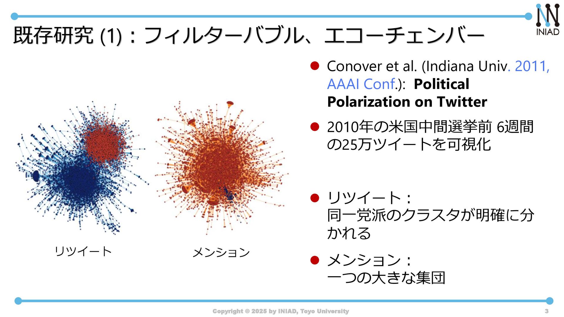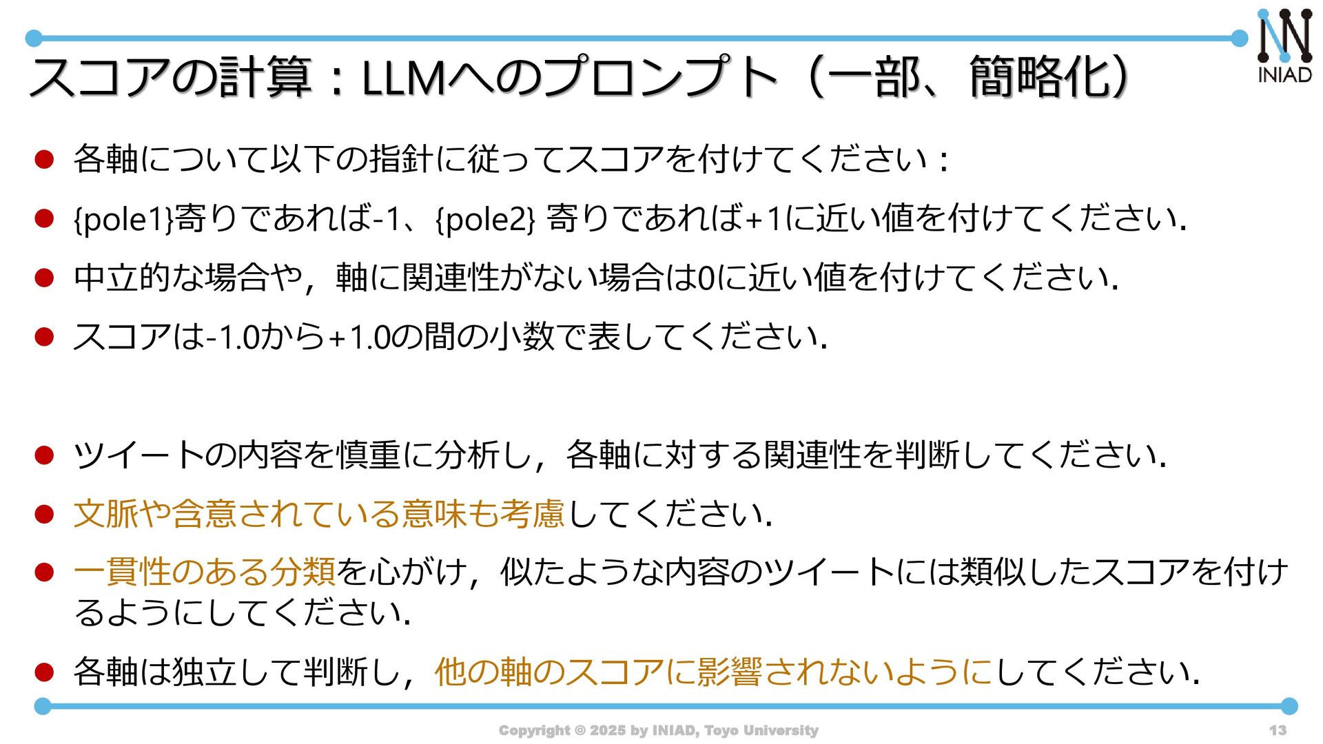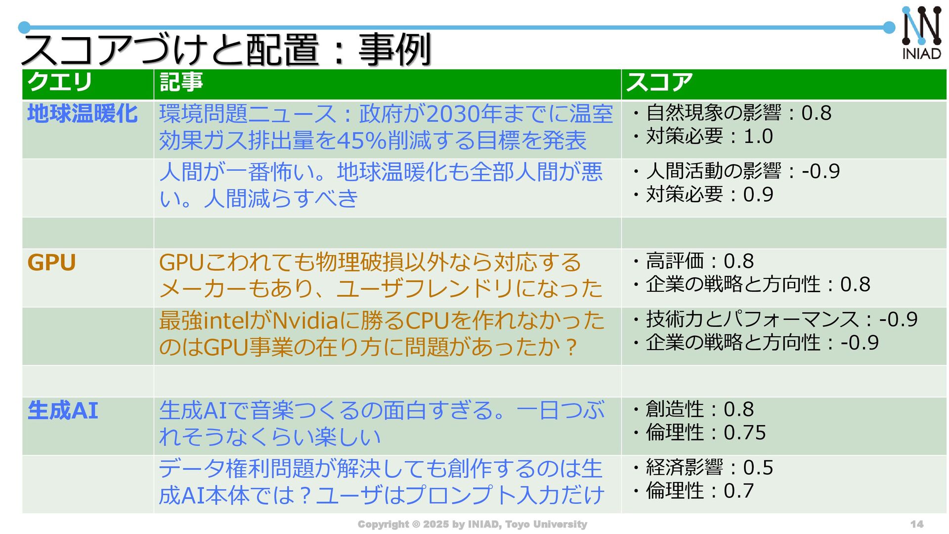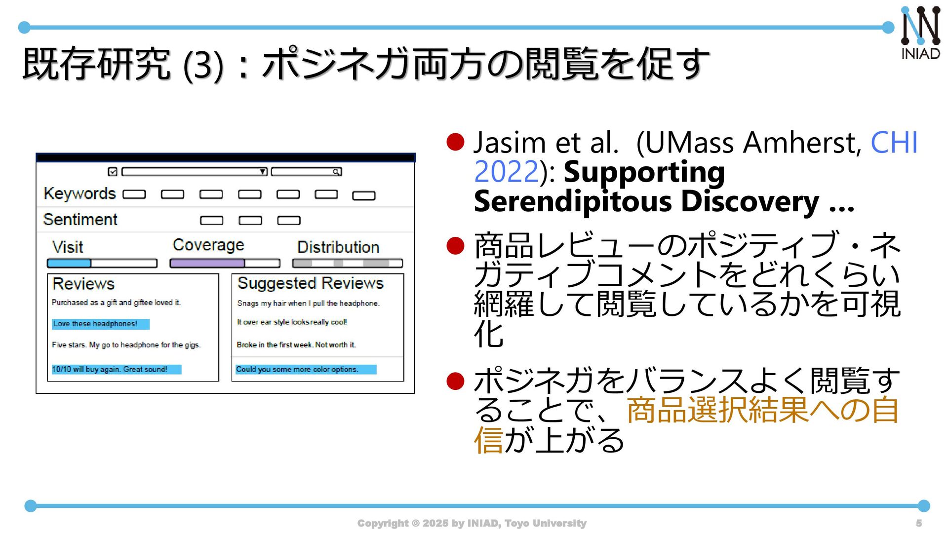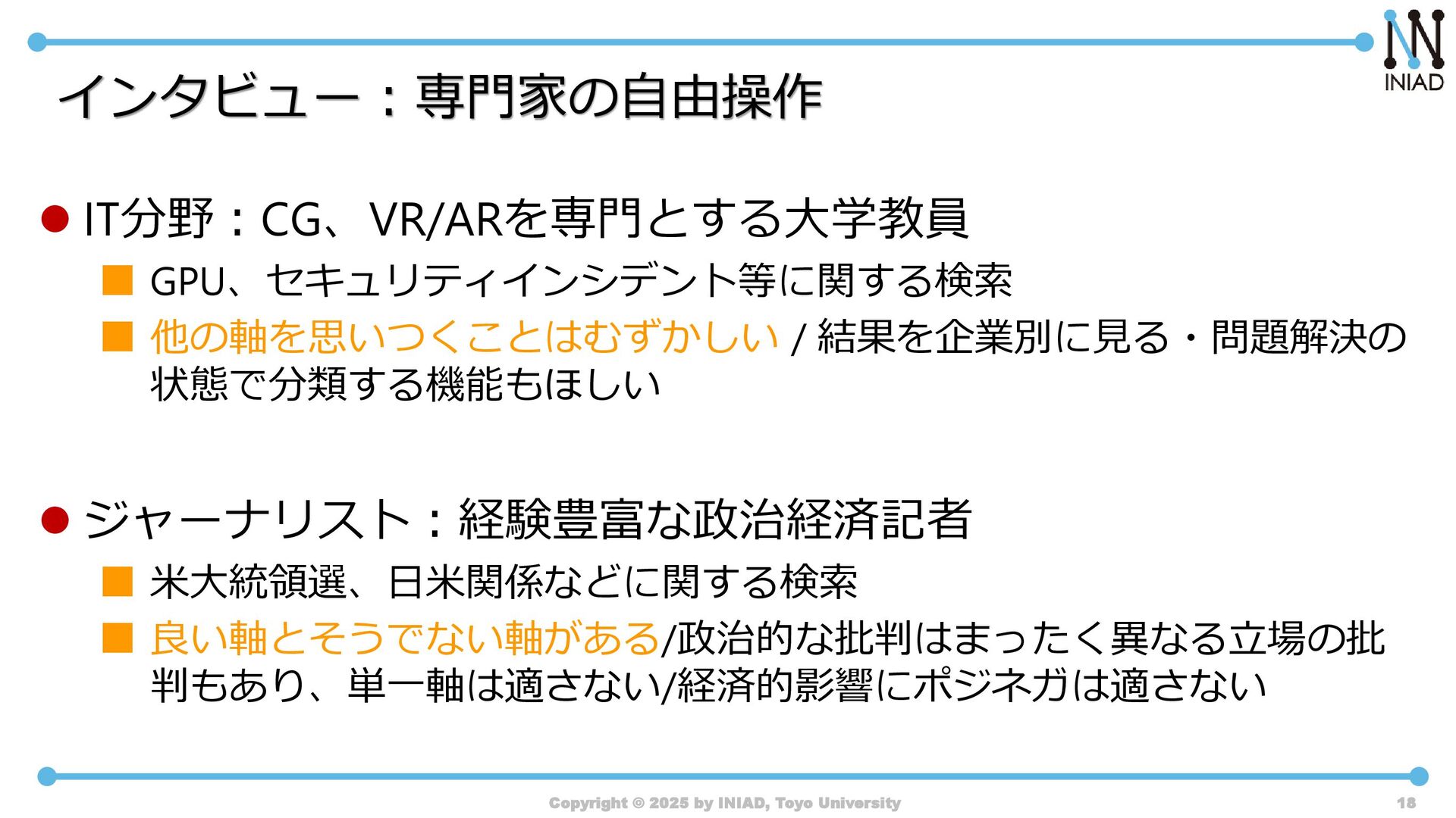 SNSの検索結果を、複数の視点から見る対話側ポジショニングマップで提示する。視点の切り出しやマッピングは、大規模言語モデル(LLM)を利用している。 フィルターバブルの軽減に向け、さまざまな視点をユーザに提供することを目的とする。