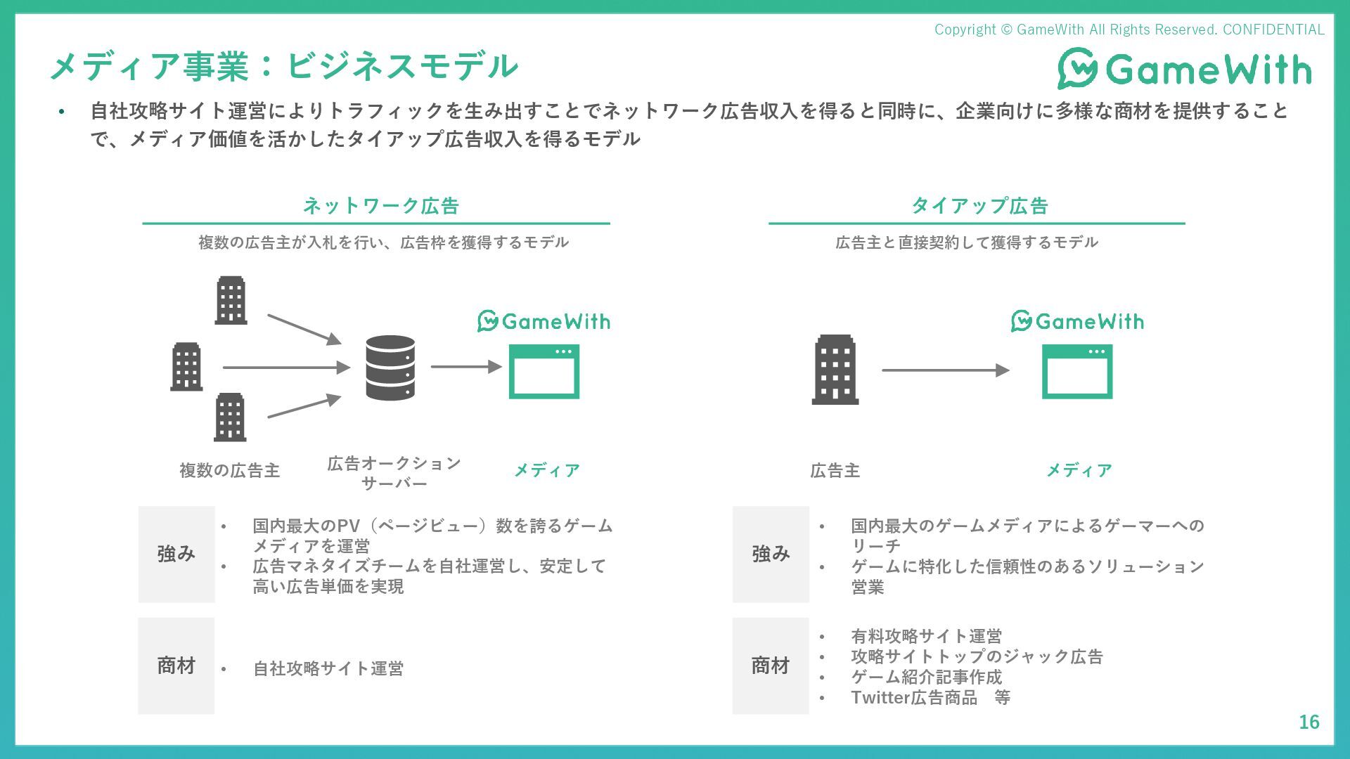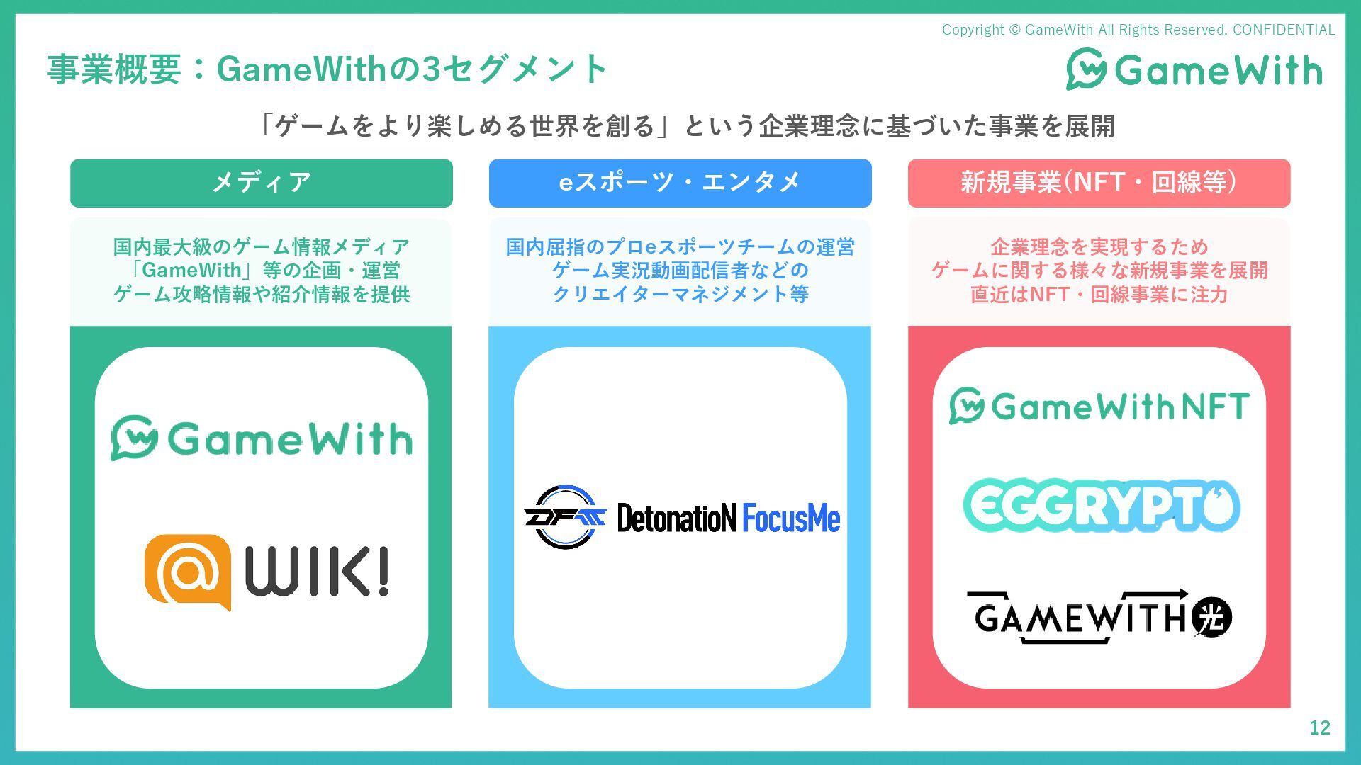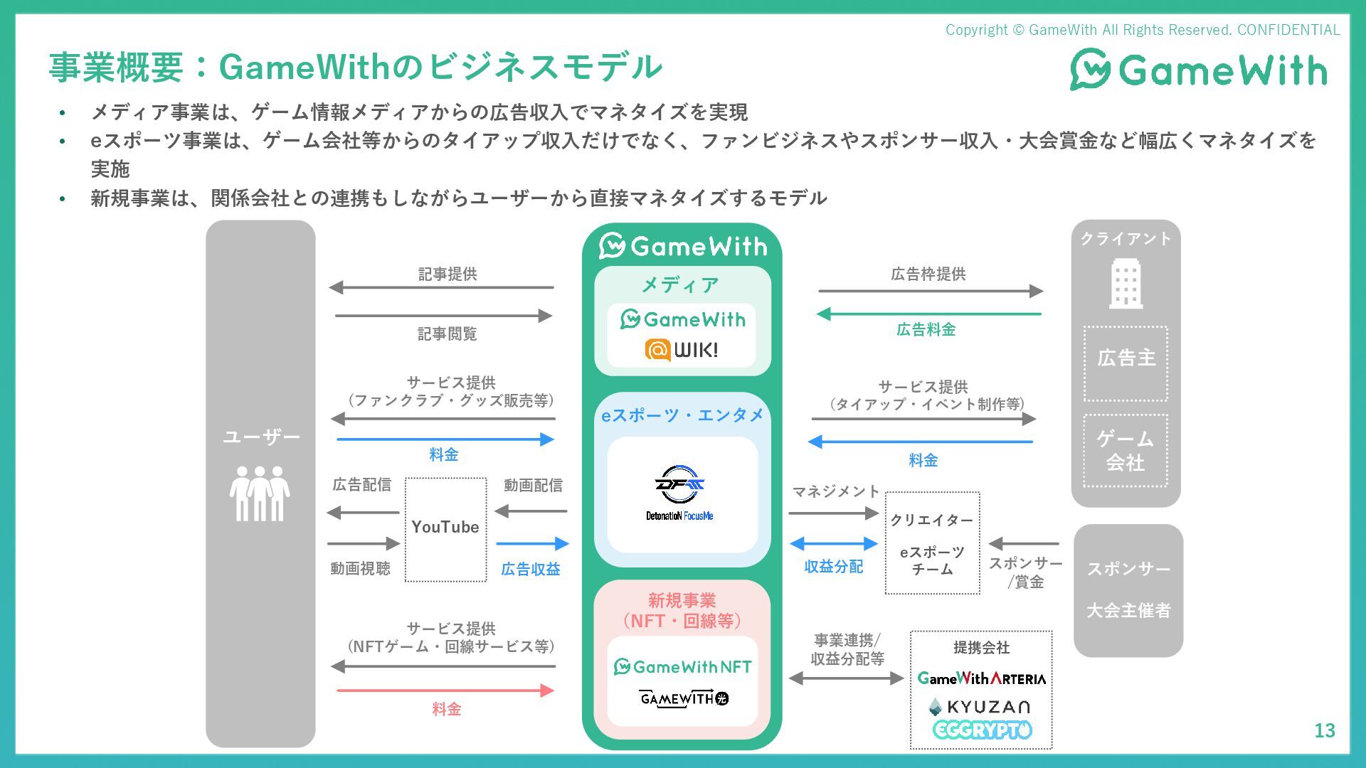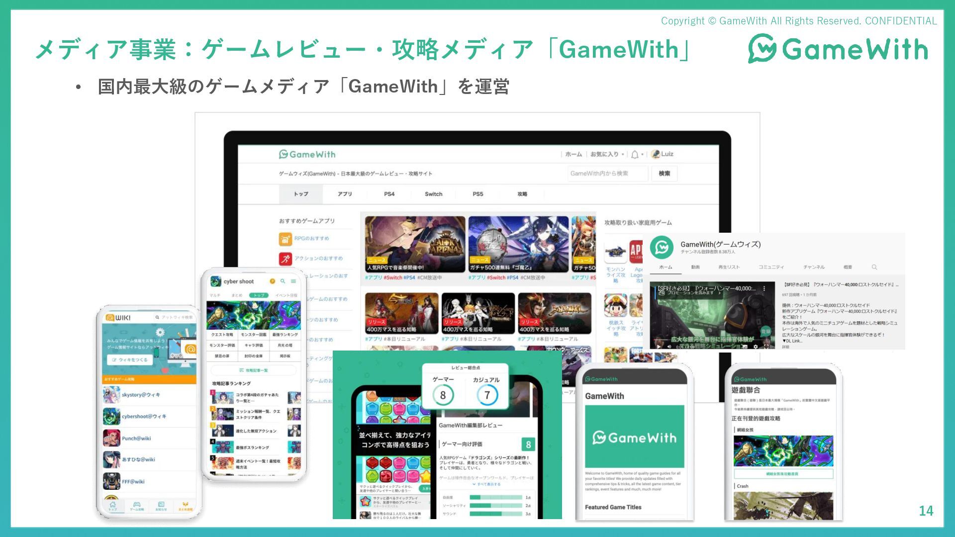 eスポーツ・エンタメ 記事提供 サービス提供 (ファンクラブ・グッズ販売等) YouTube 動画配信 広告収益 広告配信 動画視聴 料金 記事閲覧 新規事業 (NFT・回線等) サービス提供 (NFTゲーム・回線サービス等) 料金 広告主 クリエイター eスポーツ チーム マネジメント 料金 サービス提供 (タイアップ・イベント制作等) ゲーム 会社 スポンサー 大会主催者 収益分配 スポンサー /賞金 事業連携/ 収益分配等 提携会社 メディア クライアント 13 事業概要:GameWithのビジネスモデル • メディア事業は、ゲーム情報メディアからの広告収入でマネタイズを実現 • eスポーツ事業は、ゲーム会社等からのタイアップ収入だけでなく、ファンビジネスやスポンサー収入・大会賞金など幅広くマネタイズを 実施 • 新規事業は、関係会社との連携もしながらユーザーから直接マネタイズするモデル