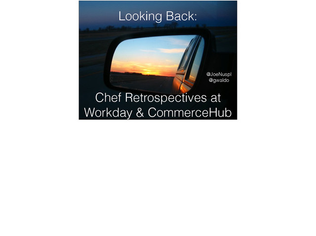 With almost ten years of combined Chef experience, join H. "Waldo" Grunenwald from CommerceHub and Joe Nuspl from Workday for a short retrospective of our our Chef experiences at smaller companies.