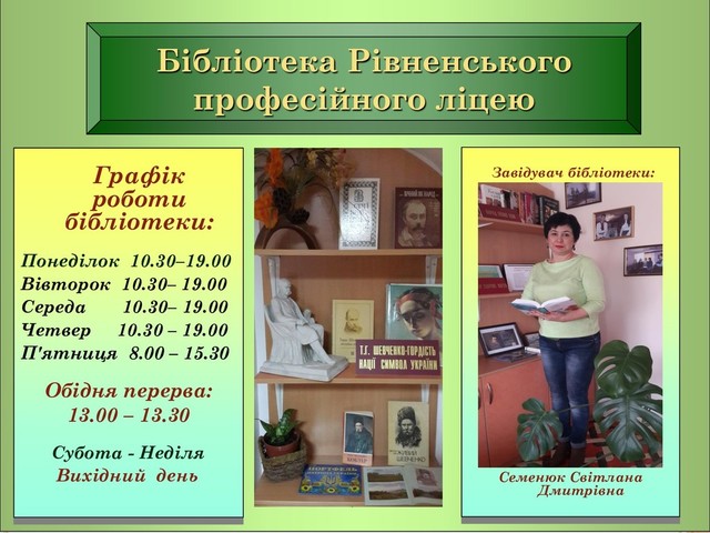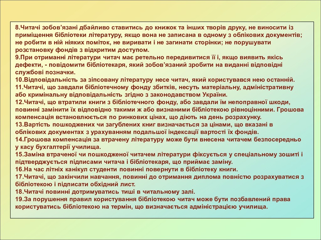 не виносити із приміщення бібліотеки літературу, якщо вона не записана в одному з облікових документів; не робити в ній ніяких поміток, не виривати і не загинати сторінки; не порушувати розстановку фондів з відкритим доступом. 9.При отриманні літератури читач має ретельно передивитися її і, якщо виявить якісь дефекти, - повідомити бібліотекаря, який зобов’язаний зробити на виданні відповідні службові позначки. 10.Відповідальність за зіпсовану літературу несе читач, який користувався нею останній. 11.Читачі, що завдали бібліотечному фонду збитків, несуть матеріальну, адміністративну або кримінальну відповідальність згідно з законодавством України. 12.Читачі, що втратили книги з бібліотечного фонду, або завдали їм непоправної шкоди, повинні замінити їх відповідно такими ж або визнаними бібліотекою рівноцінними. Грошова компенсація встановлюється по ринкових цінах, що діють на день розрахунку. 13.Вартість пошкоджених чи загублених книг визначається за цінами, що вказані в облікових документах з урахуванням подальшої індексації вартості їх фондів. 14.Грошова компенсація за втрачену літературу може бути внесена читачем безпосередньо у касу бухгалтерії училища. 15.Заміна втраченої чи пошкодженої читачем літератури фіксується у спеціальному зошиті і підтверджується підписами читача і бібліотекаря, що приймає заміну. 16.На час літніх канікул студенти повинні повернути в бібліотеку книги. 17.Читачі, що закінчили навчання, повинні до отримання диплома повністю розрахуватися з бібліотекою і підписати обхідний лист. 18.Читачі повинні дотримуватись тиші в читальному залі. 19.За порушення правил користування бібліотекою читач може бути позбавлений права користуватись бібліотекою на термін, що визначається адміністрацією училища.