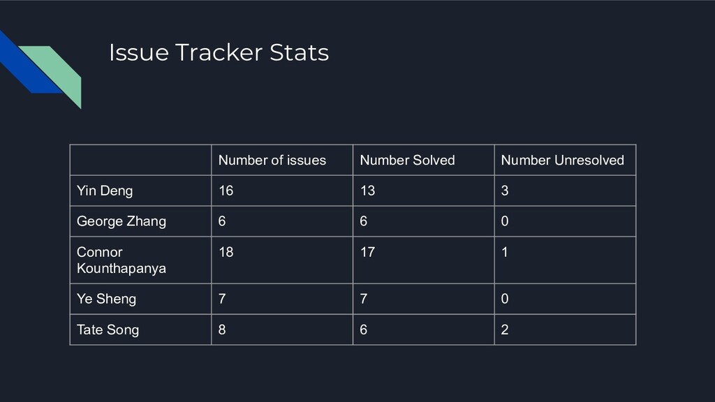 1. Issue Tracker Stats Number of issues Number Solved Number Unresolved
