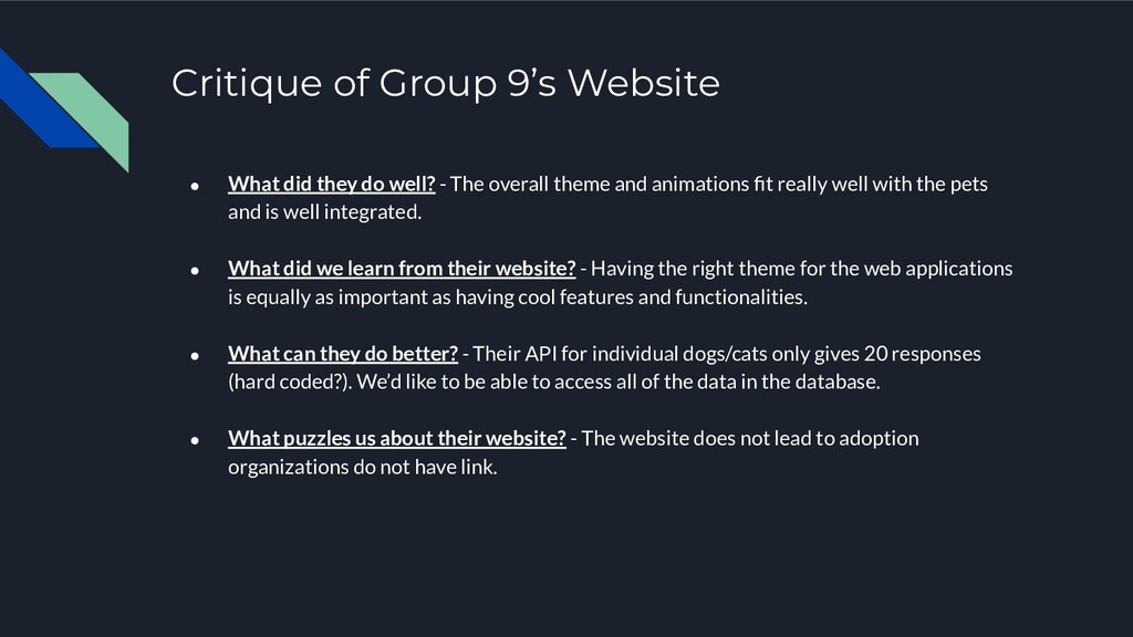 well? - The overall theme and animations fit really well with the pets and is well integrated. • What did we learn from their website? - Having the right theme for the web applications is equally as important as having cool features and functionalities. • What can they do better? - Their API for individual dogs/cats only gives 20 responses (hard coded?). We’d like to be able to access all of the data in the database. • What puzzles us about their website? - The website does not lead to adoption organizations do not have link.