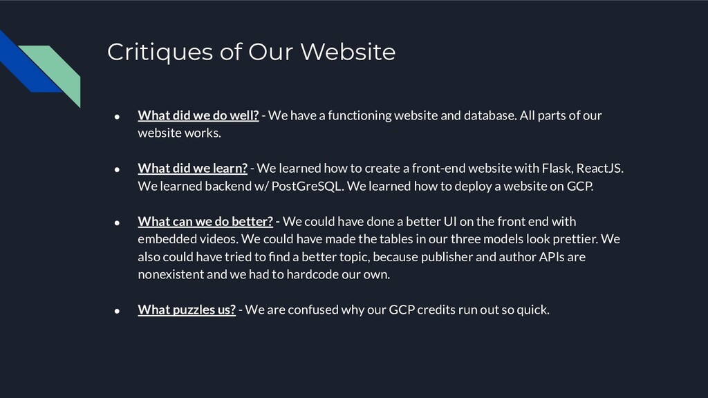 - We have a functioning website and database. All parts of our website works. • What did we learn? - We learned how to create a front-end website with Flask, ReactJS. We learned backend w/ PostGreSQL. We learned how to deploy a website on GCP. • What can we do better? - We could have done a better UI on the front end with embedded videos. We could have made the tables in our three models look prettier. We also could have tried to find a better topic, because publisher and author APIs are nonexistent and we had to hardcode our own. • What puzzles us? - We are confused why our GCP credits run out so quick.
