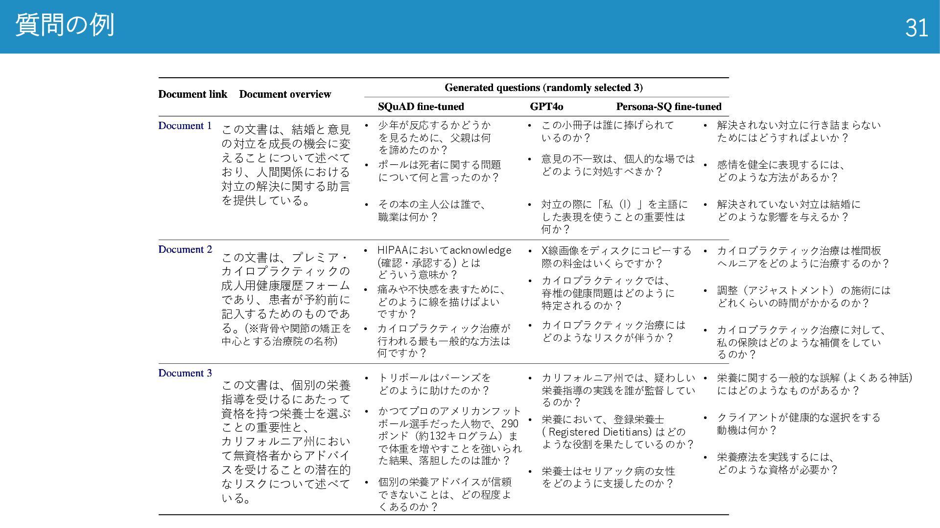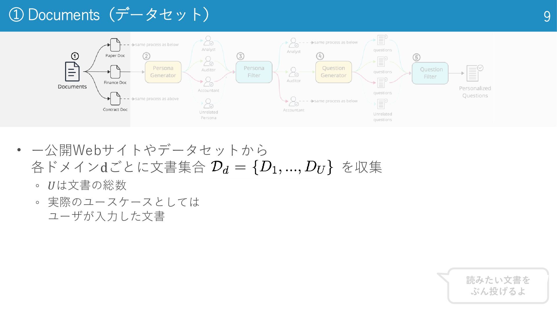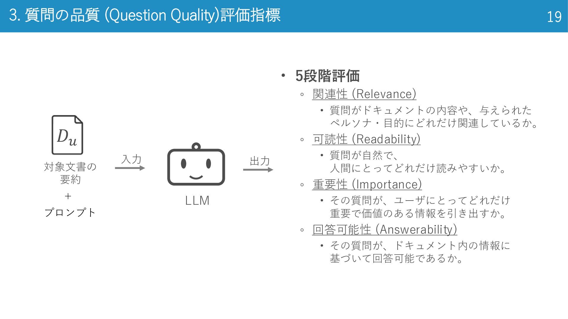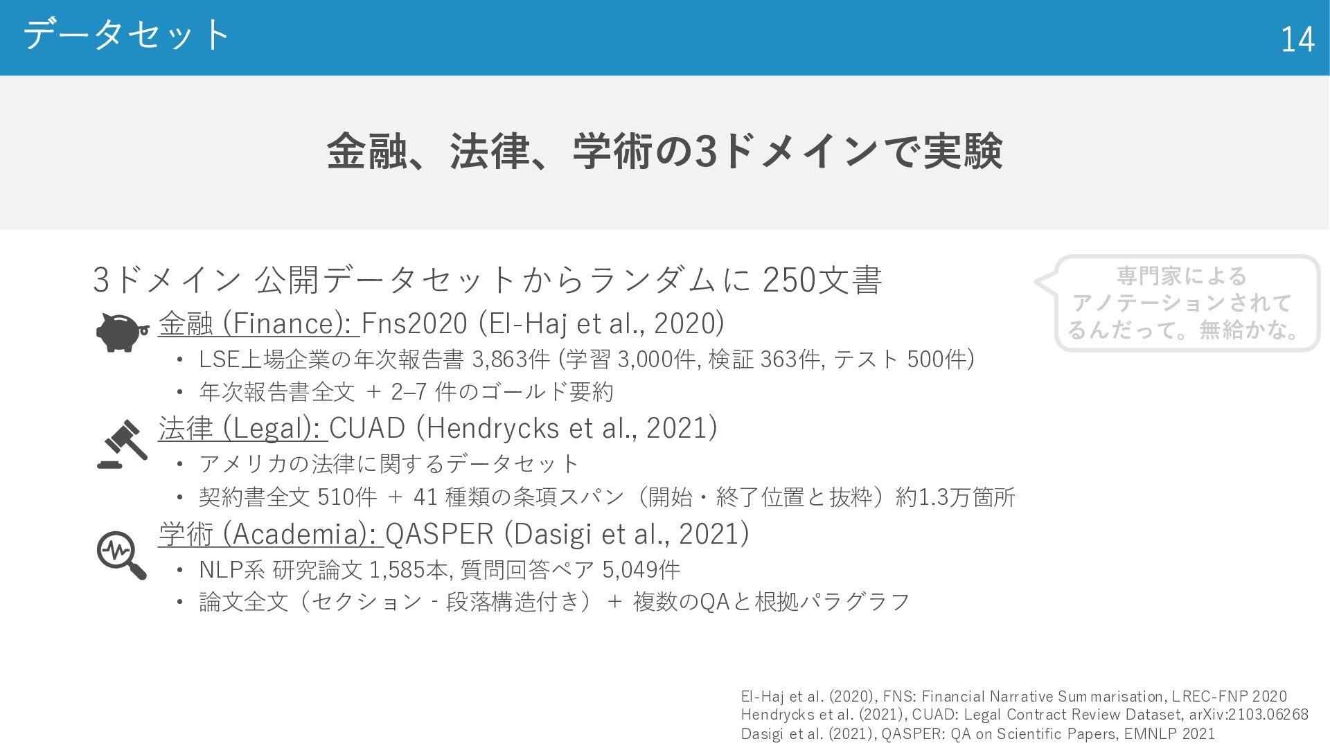 2020) • LSE上場企業の年次報告書 3,863件 (学習 3,000件, 検証 363件, テスト 500件) • 年次報告書全文 + 2–7 件のゴールド要約 ◦ 法律 (Legal): CUAD (Hendrycks et al., 2021) • アメリカの法律に関するデータセット • 契約書全文 510件 + 41 種類の条項スパン(開始・終了位置と抜粋)約1.3万箇所 ◦ 学術 (Academia): QASPER (Dasigi et al., 2021) • NLP系 研究論文 1,585本, 質問回答ペア 5,049件 • 論文全文(セクション‐段落構造付き)+ 複数のQAと根拠パラグラフ 金融、法律、学術の3ドメインで実験 データセット 14 El-Haj et al. (2020), FNS: Financial Narrative Summarisation, LREC-FNP 2020 Hendrycks et al. (2021), CUAD: Legal Contract Review Dataset, arXiv:2103.06268 Dasigi et al. (2021), QASPER: QA on Scientific Papers, EMNLP 2021 専門家による アノテーションされて るんだって。無給かな。
