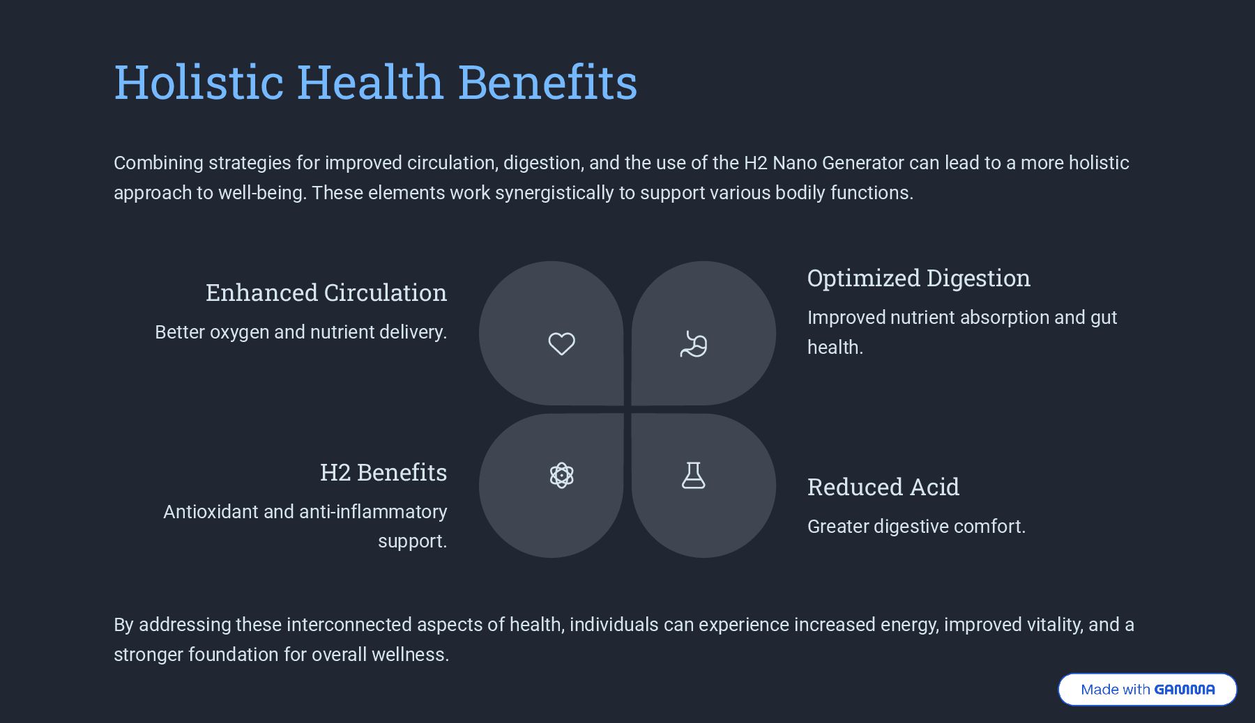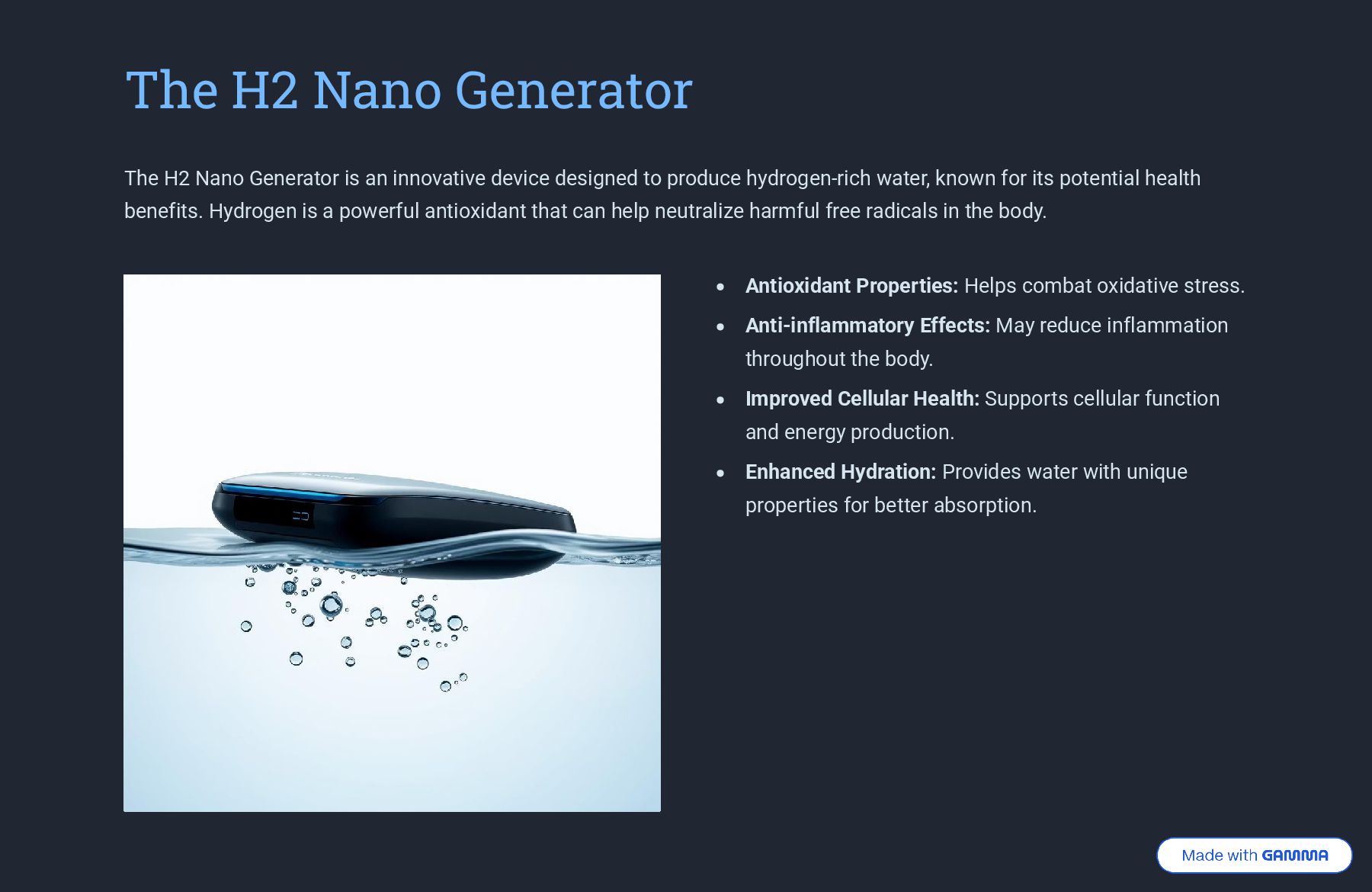 Experience the power of H2 Nano Technology with our innovative solution designed to enhance well-being, improve blood circulation, and support healthy digestion. Harness the natural benefits of molecular hydrogen to boost energy, reduce fatigue, and promote overall vitality — all from within. Perfect for anyone seeking a natural path to better health and balance.