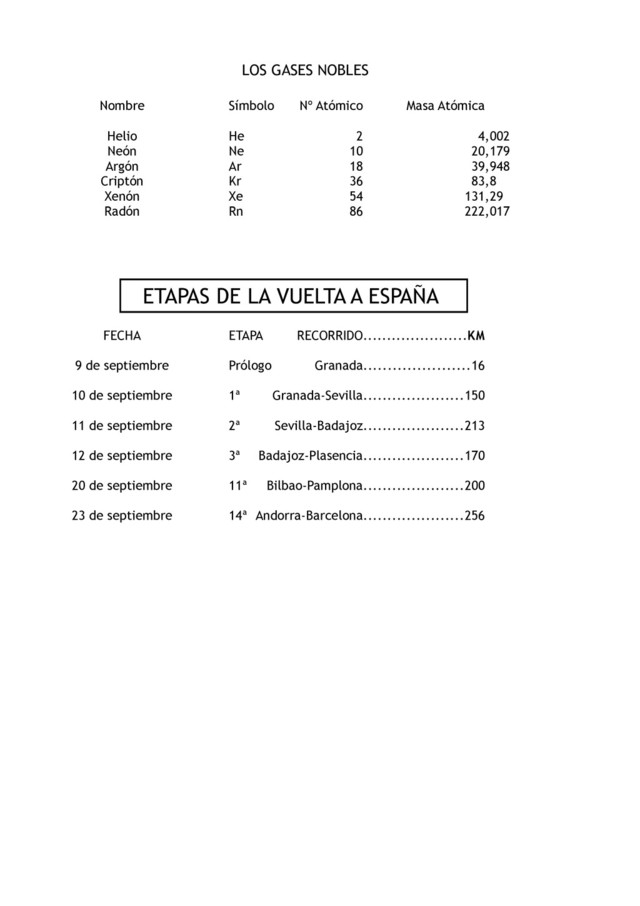 He 2 4,002 Neón Ne 10 20,179 Argón Ar 18 39,948 Criptón Kr 36 83,8 Xenón Xe 54 131,29 Radón Rn 86 222,017 ETAPAS DE LA VUELTA A ESPAÑA FECHA ETAPA RECORRIDO......................KM 9 de septiembre Prólogo Granada......................16 10 de septiembre 1ª Granada-Sevilla.....................150 11 de septiembre 2ª Sevilla-Badajoz.....................213 12 de septiembre 3ª Badajoz-Plasencia.....................170 20 de septiembre 11ª Bilbao-Pamplona.....................200 23 de septiembre 14ª Andorra-Barcelona.....................256