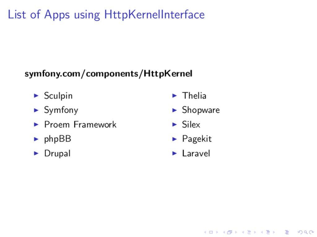 multiple Application Kernels to one. Use Symfony, Silex, Drupal, Ez, BoltCM, . . . in combination. Have single-purpose-application, decorated to our needs. even interact with external services using HttpKernelInterface.