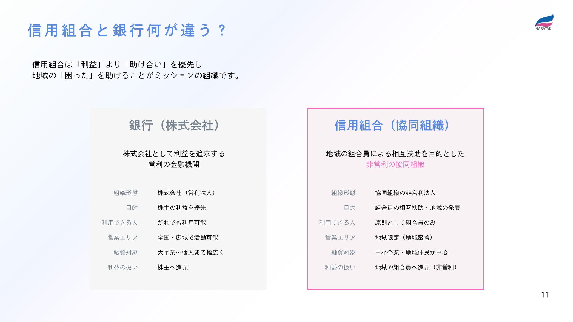 株主の利益を優先 だれでも利用可能 全国・広域で活動可能 大企業~個人まで幅広く 株主へ還元 信用組合(協同組織) 地域の組合員による相互扶助を目的とした 非営利の協同組織 組織形態 目的 利用できる人 営業エリア 融資対象 利益の扱い 協同組織の非営利法人 組合員の相互扶助・地域の発展 原則として組合員のみ 地域限定(地域密着) 中小企業・地域住民が中心 地域や組合員へ還元(非営利) 信用組合は「利益」より「助け合い」を優先し 地域の「困った」を助けることがミッションの組織です。 信 用 組 合 と 銀 行 何 が 違 う ? 11