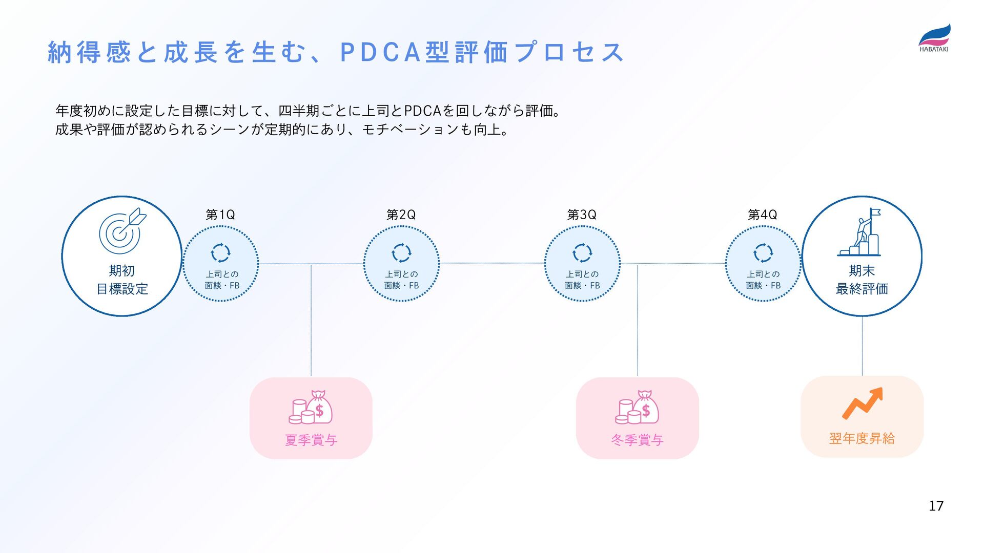 期末 最終評価 第1Q 第2Q 第3Q 第4Q 夏季賞与 冬季賞与 翌年度昇給 年度初めに設定した目標に対して、四半期ごとに上司とPDCAを回しながら評価。 成果や評価が認められるシーンが定期的にあり、モチベーションも向上。 納 得 感 と 成 長 を 生 む 、 P D C A 型 評 価 プ ロ セ ス 17