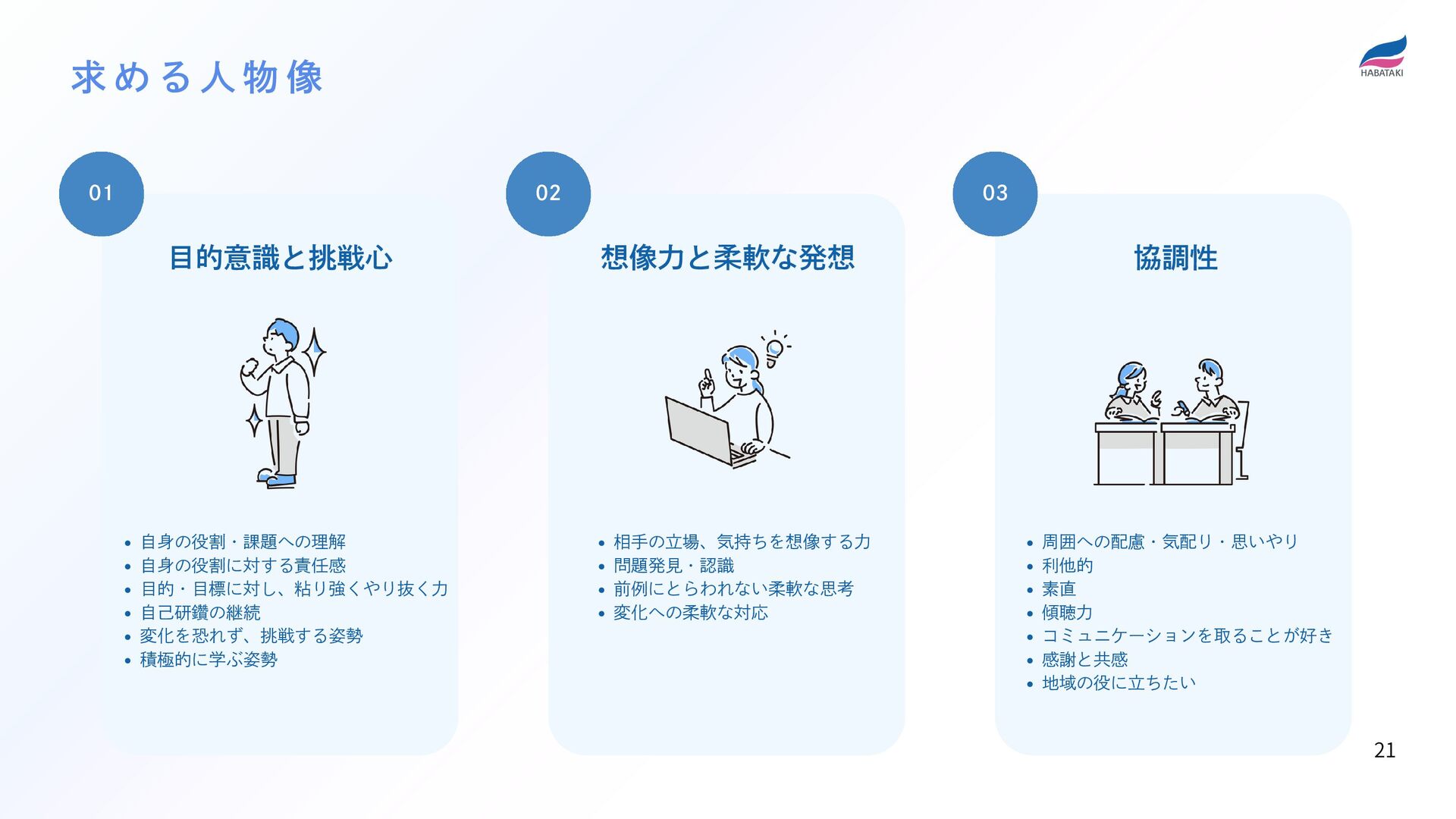 変化を恐れず、挑戦する姿勢 積極的に学ぶ姿勢 相手の立場、気持ちを想像する力 問題発見・認識 前例にとらわれない柔軟な思考 変化への柔軟な対応 周囲への配慮・気配り・思いやり 利他的 素直 傾聴力 コミュニケーションを取ることが好き 感謝と共感 地域の役に立ちたい 求 め る 人 物 像 21