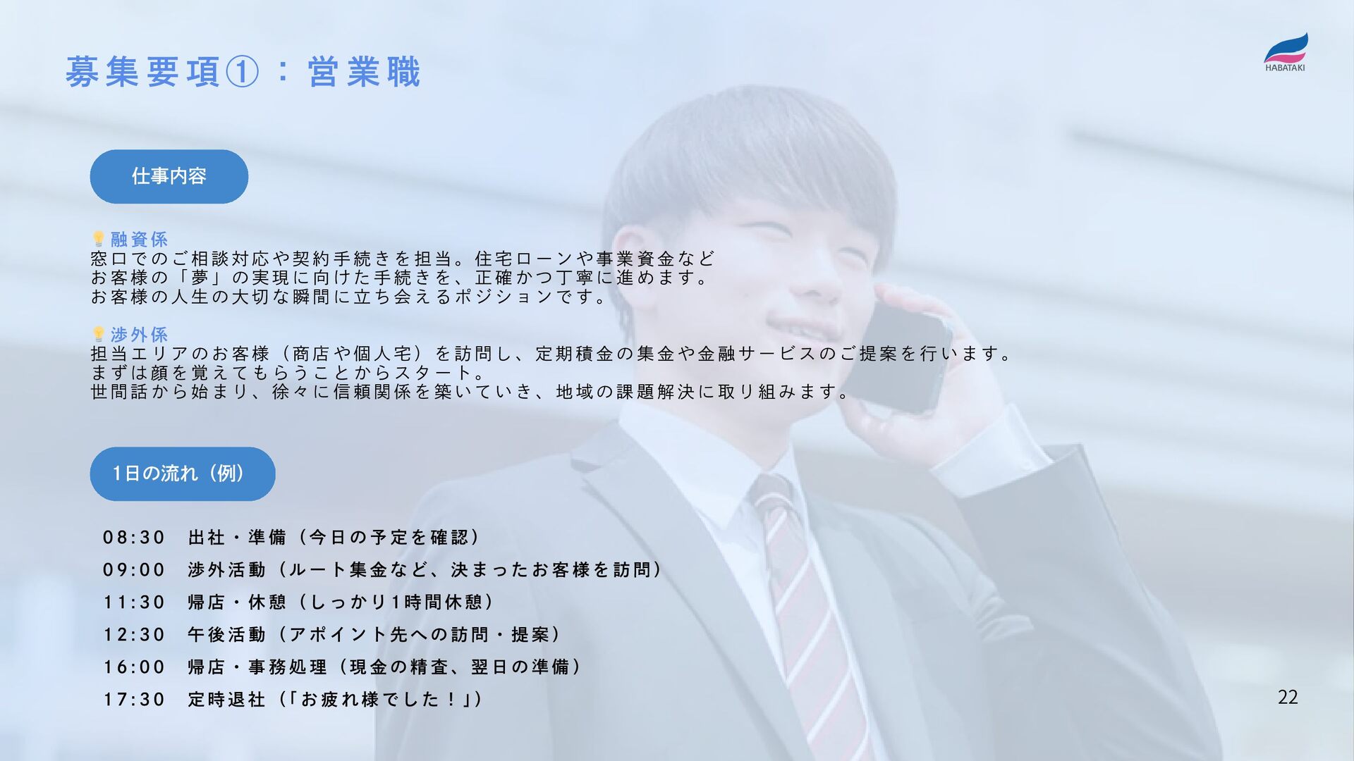 相 談 対 応 や 契 約 手 続 き を 担 当 。 住 宅 ロ ー ン や 事 業 資 金 な ど お 客 様 の 「 夢 」 の 実 現 に 向 け た 手 続 き を 、 正 確 か つ 丁 寧 に 進 め ま す 。 お 客 様 の 人 生 の 大 切 な 瞬 間 に 立 ち 会 え る ポ ジ シ ョ ン で す 。 💡渉 外 係 担 当 エ リ ア の お 客 様 ( 商 店 や 個 人 宅 ) を 訪 問 し 、 定 期 積 金 の 集 金 や 金 融 サ ー ビ ス の ご 提 案 を 行 い ま す 。 ま ず は 顔 を 覚 え て も ら う こ と か ら ス タ ー ト 。 世 間 話 か ら 始 ま り 、 徐 々 に 信 頼 関 係 を 築 い て い き 、 地 域 の 課 題 解 決 に 取 り 組 み ま す 。 0 8 : 3 0   出 社 ・ 準 備 ( 今 日 の 予 定 を 確 認 ) 0 9 : 0 0   渉 外 活 動 ( ル ー ト 集 金 な ど 、 決 ま っ た お 客 様 を 訪 問 ) 1 1 : 3 0   帰 店 ・ 休 憩 ( し っ か り 1 時 間 休 憩 ) 1 2 : 3 0   午 後 活 動 ( ア ポ イ ン ト 先 へ の 訪 問 ・ 提 案 ) 1 6 : 0 0   帰 店 ・ 事 務 処 理 ( 現 金 の 精 査 、 翌 日 の 準 備 ) 1 7 : 3 0   定 時 退 社 ( 「 お 疲 れ 様 で し た ! 」 ) 募 集 要 項 ① : 営 業 職 22