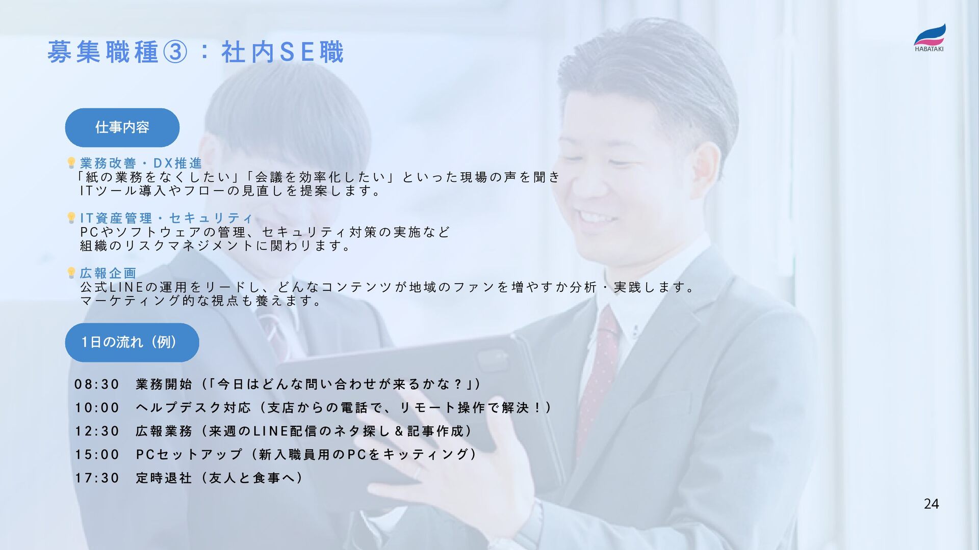 進 「 紙 の 業 務 を な く し た い 」 「 会 議 を 効 率 化 し た い 」 と い っ た 現 場 の 声 を 聞 き   I T ツ ー ル 導 入 や フ ロ ー の 見 直 し を 提 案 し ま す 。 💡I T 資 産 管 理 ・ セ キ ュ リ テ ィ   P C や ソ フ ト ウ ェ ア の 管 理 、 セ キ ュ リ テ ィ 対 策 の 実 施 な ど   組 織 の リ ス ク マ ネ ジ メ ン ト に 関 わ り ま す 。 💡広 報 企 画   公 式 L I N E の 運 用 を リ ー ド し 、 ど ん な コ ン テ ン ツ が 地 域 の フ ァ ン を 増 や す か 分 析 ・ 実 践 し ま す 。   マ ー ケ テ ィ ン グ 的 な 視 点 も 養 え ま す 。 0 8 : 3 0   業 務 開 始 ( 「 今 日 は ど ん な 問 い 合 わ せ が 来 る か な ? 」 ) 1 0 : 0 0   ヘ ル プ デ ス ク 対 応 ( 支 店 か ら の 電 話 で 、 リ モ ー ト 操 作 で 解 決 ! ) 1 2 : 3 0   広 報 業 務 ( 来 週 の L I N E 配 信 の ネ タ 探 し & 記 事 作 成 ) 1 5 : 0 0   P C セ ッ ト ア ッ プ ( 新 入 職 員 用 の P C を キ ッ テ ィ ン グ ) 1 7 : 3 0   定 時 退 社 ( 友 人 と 食 事 へ ) 募 集 職 種 ③ : 社 内 S E 職 24