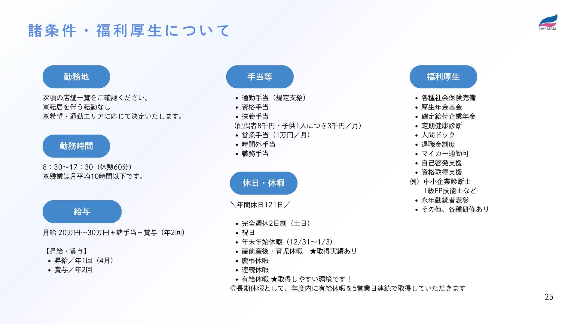 有給休暇 ★取得しやすい環境です! ◎長期休暇として、年度内に有給休暇を5営業日連続で取得していただきます 各種社会保険完備 厚生年金基金 確定給付企業年金 定期健康診断 人間ドック 退職金制度 マイカー通勤可 自己啓発支援 資格取得支援 例)中小企業診断士   1級FP技能士など 永年勤続者表彰 その他、各種研修あり 通勤手当(規定支給) 資格手当 扶養手当 (配偶者8千円・子供1人につき3千円/月) 営業手当(1万円/月) 時間外手当 職務手当 次項の店舗一覧をご確認ください。 ※転居を伴う転勤なし ※希望・通勤エリアに応じて決定いたします。 給与 月給 20万円~30万円+諸手当+賞与(年2回) 【昇給・賞与】 昇給/年1回(4月) 賞与/年2回 休日・休暇 勤務地 手当等 福利厚生 諸 条 件 ・ 福 利 厚 生 に つ い て 25