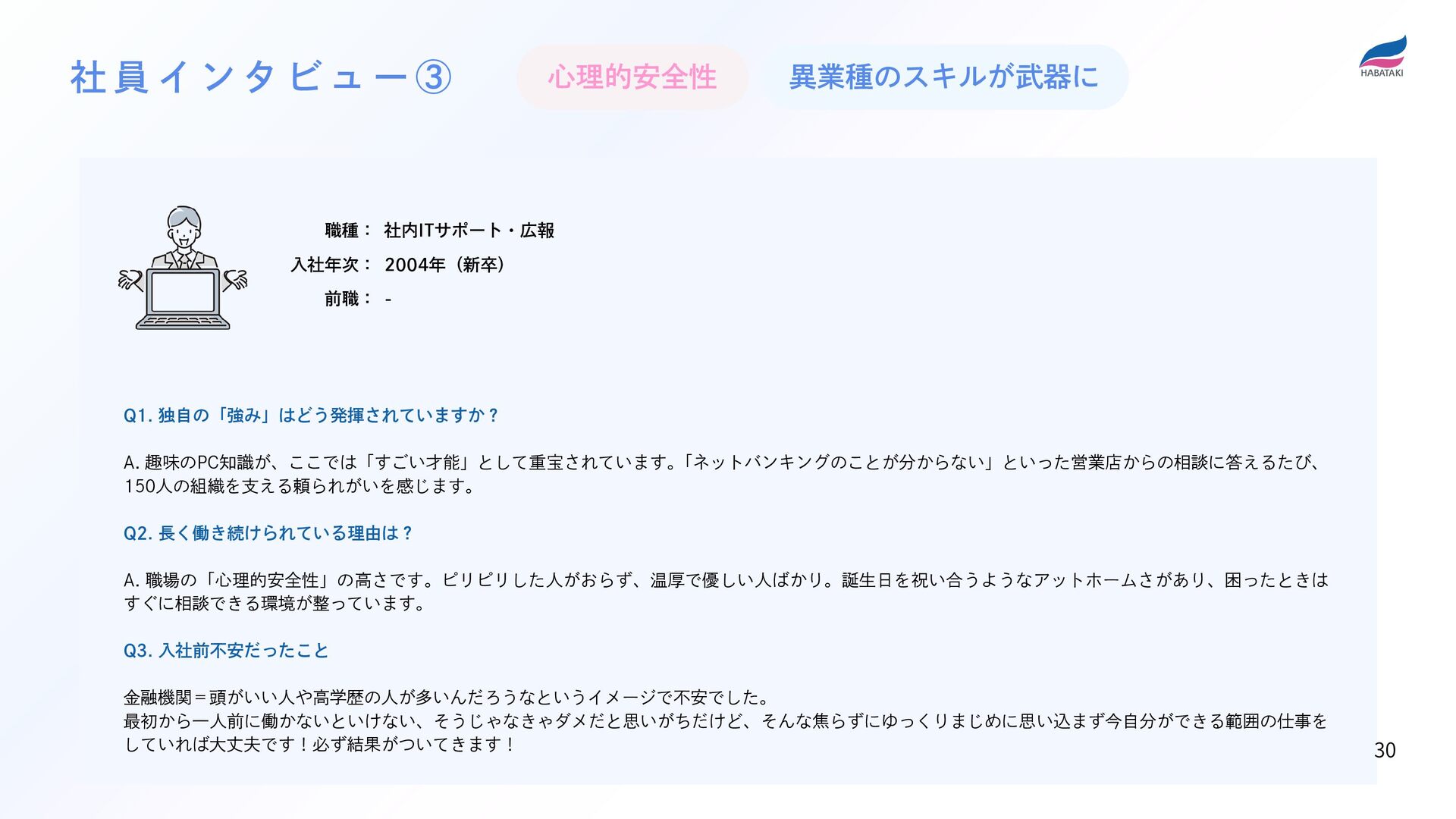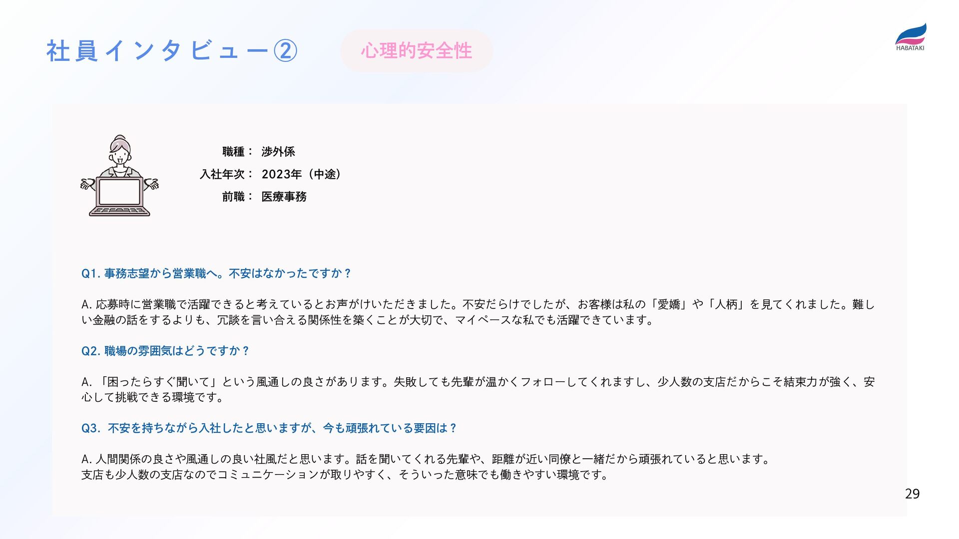 Q3. 不安を持ちながら入社したと思いますが、今も頑張れている要因は? A. 人間関係の良さや風通しの良い社風だと思います。話を聞いてくれる先輩や、距離が近い同僚と一緒だから頑張れていると思います。 支店も少人数の支店なのでコミュニケーションが取りやすく、そういった意味でも働きやすい環境です。 社 員 イ ン タ ビ ュ ー ② 心理的安全性 職種: 入社年次: 前職: 渉外係 2023年(中途) 医療事務 29