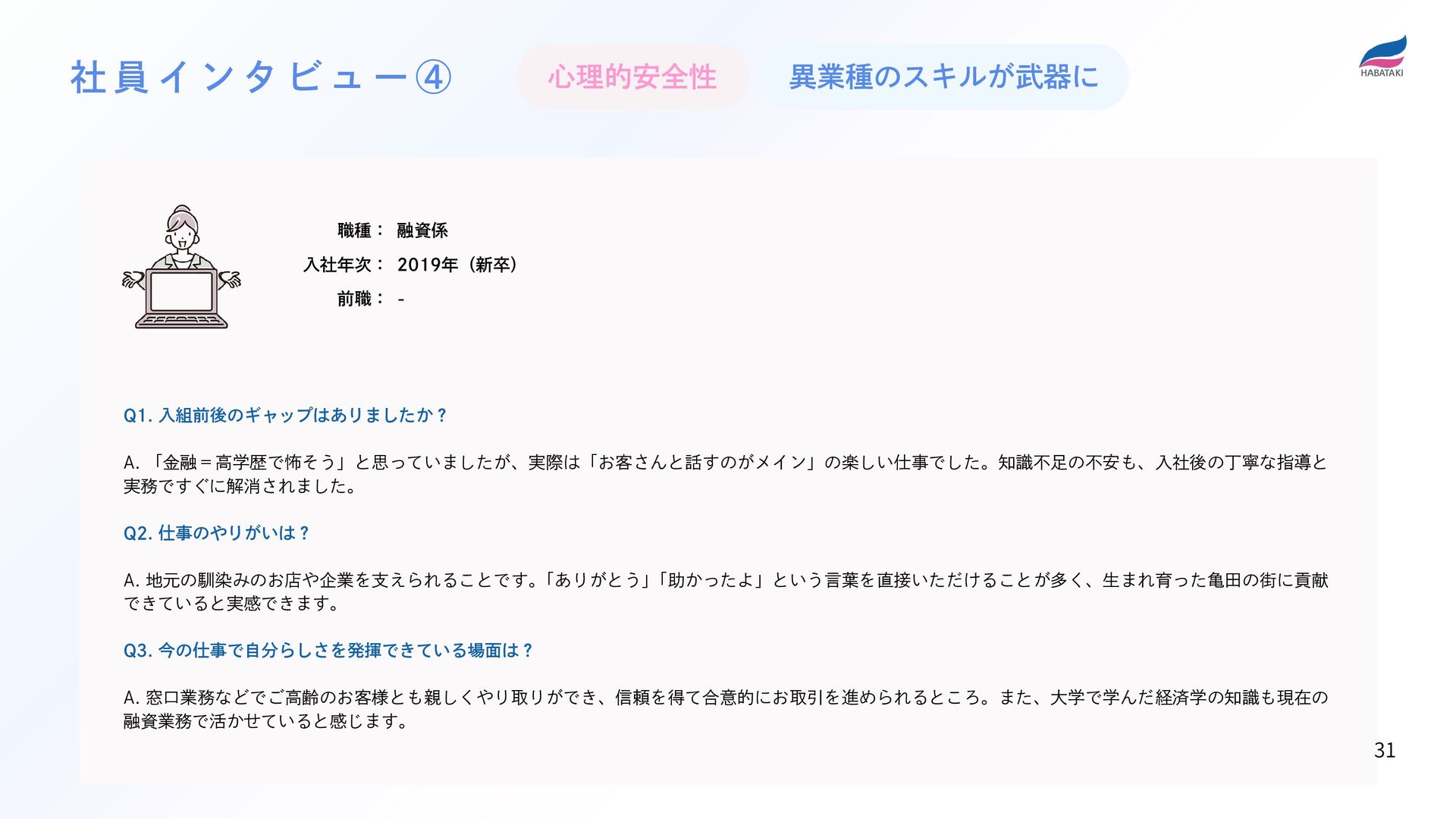 「助かったよ」という言葉を直接いただけることが多く、生まれ育った亀田の街に貢献 できていると実感できます。 Q3. 今の仕事で自分らしさを発揮できている場面は? A. 窓口業務などでご高齢のお客様とも親しくやり取りができ、信頼を得て合意的にお取引を進められるところ。また、大学で学んだ経済学の知識も現在の 融資業務で活かせていると感じます。 社 員 イ ン タ ビ ュ ー ④ 心理的安全性 職種: 入社年次: 前職: 融資係 2019年(新卒) - 異業種のスキルが武器に 31