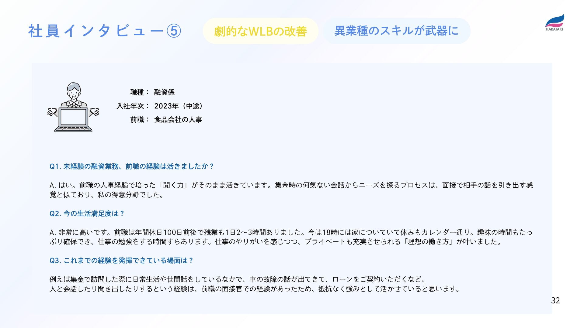 覚と似ており、私の得意分野でした。 Q2. 今の生活満足度は? A. 非常に高いです。前職は年間休日100日前後で残業も1日2~3時間ありました。今は18時には家についていて休みもカレンダー通り。趣味の時間もたっ ぷり確保でき、仕事の勉強をする時間すらあります。仕事のやりがいを感じつつ、プライベートも充実させられる「理想の働き方」が叶いました。 Q3. これまでの経験を発揮できている場面は? 例えば集金で訪問した際に日常生活や世間話をしているなかで、車の故障の話が出てきて、ローンをご契約いただくなど、 人と会話したり聞き出したりするという経験は、前職の面接官での経験があったため、抵抗なく強みとして活かせていると思います。 社 員 イ ン タ ビ ュ ー ⑤ 劇的なWLBの改善 異業種のスキルが武器に 32