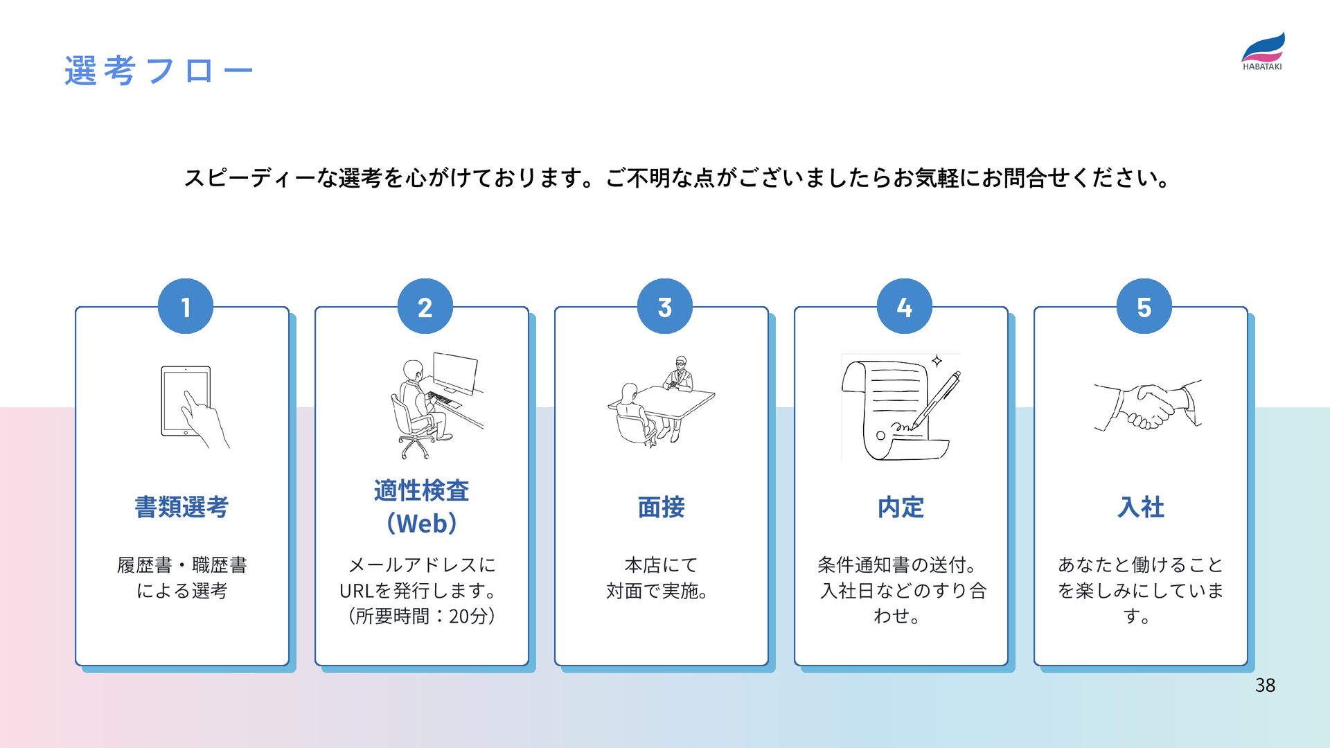 メールアドレスに URLを発行します。 (所要時間:20分) 面接 本店にて 対面で実施。 内定 条件通知書の送付。 入社日などのすり合 わせ。 入社 あなたと働けること を楽しみにしていま す。 スピーディーな選考を心がけております。ご不明な点がございましたらお気軽にお問合せください。 選 考 フ ロ ー 38