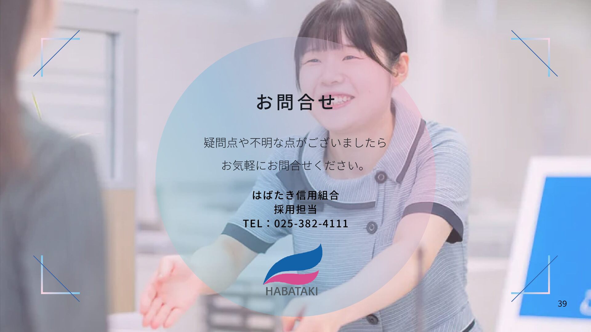 21. Q1. 入組前後のギャップはありましたか? A. 「金融=高学歴で怖そう」と思っていましたが、実際は「お客さんと話すのがメイン」の楽しい仕事でした。知識不足の不安も、入社後の丁寧な指導と 実務ですぐに解消されました。 Q2. 仕事のやりがいは? A. 地元の馴染みのお店や企業を支えられることです。 「ありがとう」