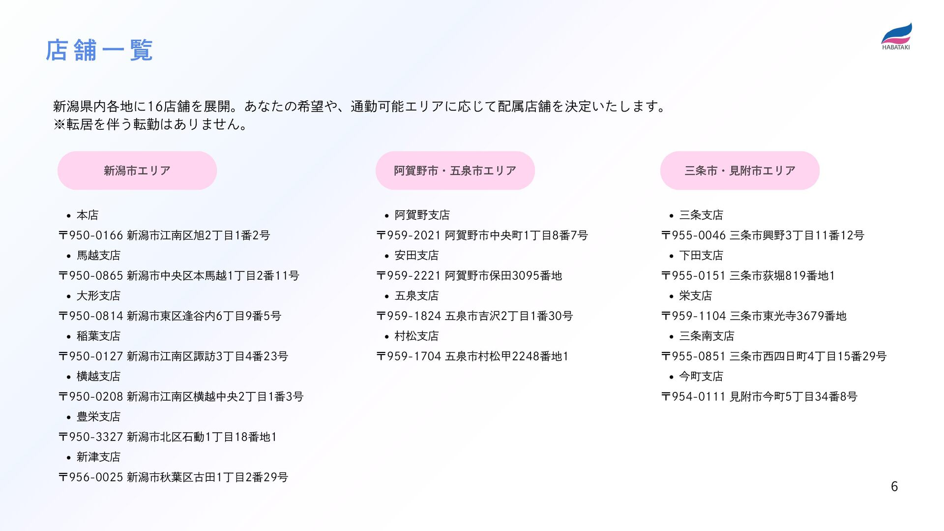 4. 新潟市エリア 新潟県内各地に16店舗を展開。あなたの希望や、通勤可能エリアに応じて配属店舗を決定いたします。 ※転居を伴う転勤はありません。 阿賀野市・五泉市エリア 三条市・見附市エリア 本店 〒950-0166 新潟市江南区旭2丁目1番2号 馬越支店 〒950-0865