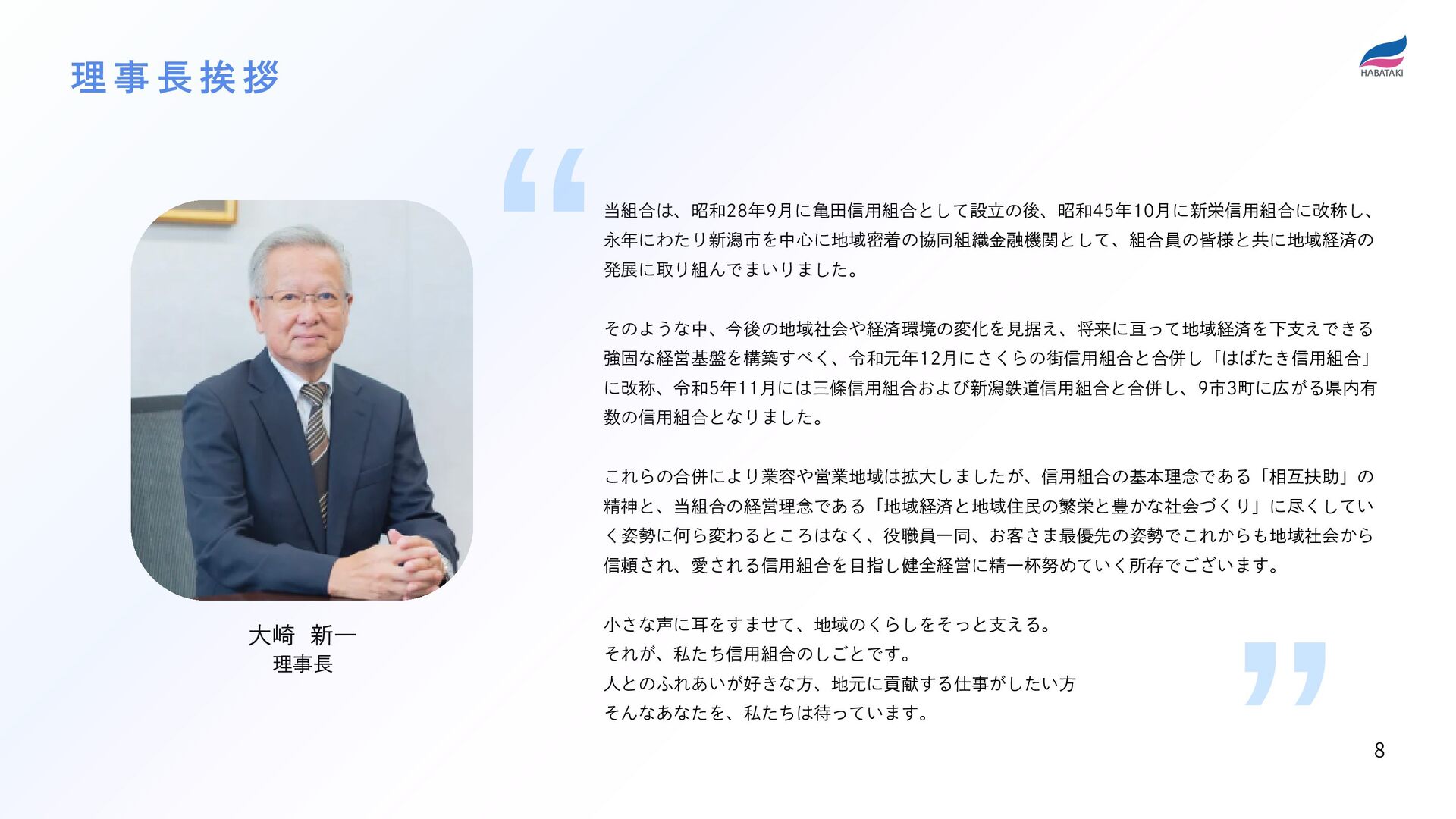 5. 当組合は、昭和28年9月に亀田信用組合として設立の後、昭和45年10月に新栄信用組合に改称し、 永年にわたり新潟市を中心に地域密着の協同組織金融機関として、組合員の皆様と共に地域経済の 発展に取り組んでまいりました。 そのような中、今後の地域社会や経済環境の変化を見据え、将来に亘って地域経済を下支えできる 強固な経営基盤を構築すべく、令和元年12月にさくらの街信用組合と合併し「はばたき信用組合」 に改称、令和5年11月には三條信用組合および新潟鉄道信用組合と合併し、9市3町に広がる県内有 数の信用組合となりました。 これらの合併により業容や営業地域は拡大しましたが、信用組合の基本理念である「相互扶助」の 精神と、当組合の経営理念である「地域経済と地域住民の繁栄と豊かな社会づくり」に尽くしてい く姿勢に何ら変わるところはなく、役職員一同、お客さま最優先の姿勢でこれからも地域社会から