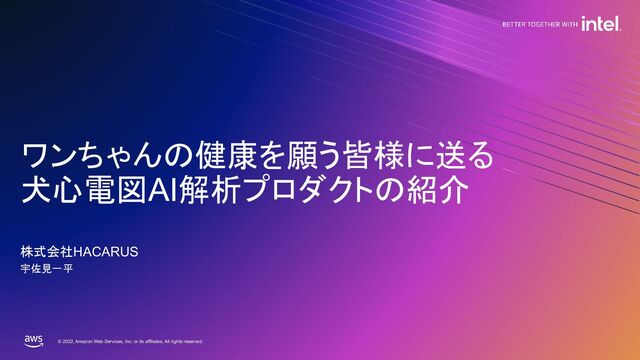rights reserved. © 2022, Amazon Web Services, Inc. or its affiliates. All rights reserved. ワンちゃんの健康を願う皆様に送る 犬心電図AI解析プロダクトの紹介 株式会社HACARUS 宇佐見一平