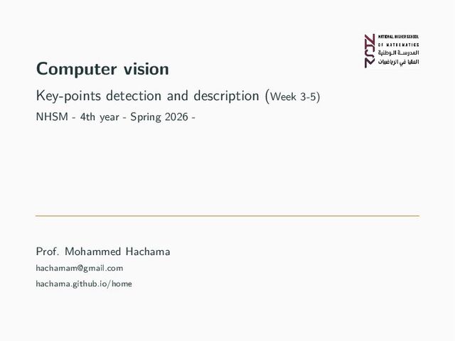 W for the shift [u, v]: E(u, v) = (x,y)∈W [I(x + u, y + v) − I(x, y)]2 • First-order Taylor approximation I(x + u, y + v) ≈ I(x, y) + Ix (x, y)u + Iy (x, y)v • Let’s plug this into E(u, v) E(u, v) ≈ (x,y)∈W [I(x, y) + Ix (x, y)u + Iy (x, y)v − I(x, y)]2 ≈ (x,y)∈W I2 x u2 + 2Ix Iy uv + I2 y v2 NHSM - 4th year: Computer vision - Keypoints (Week 3-5) - M. Hachama (