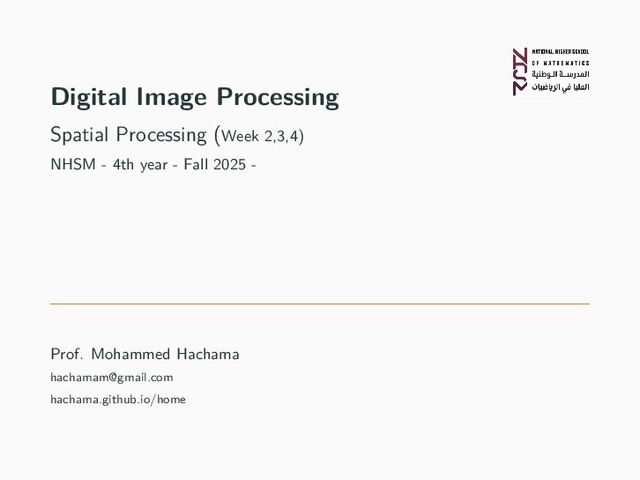 OpenCV library and that performs all the methods of this lecture: 1. Point transformations 2. Local Transformations 3. Global Transformations: AHE, CLAHE, Histogram Equalization, Histogram Specification 4. Linear Filtering: Mean, Gaussian, Gradient, Laplacian, with applications. 5. Non-linear filtering: Min, Max, Median, and Mean Shift Filters. Simulations should be conducted to evaluate (qualitative and quantitative) and compare the methods with various parameters. NHSM - 4th year: Digital Image Processing - Spatial Processing (Week 2,3,4) - M. Hachama (
