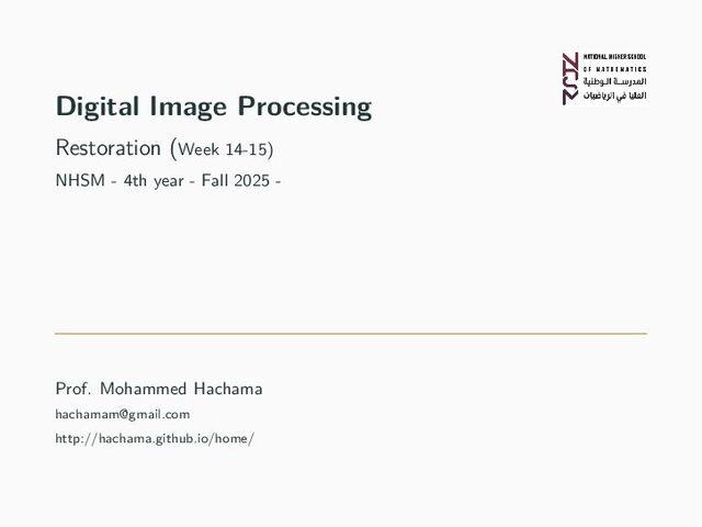 object=1 • Slide the structuring element over the pixels • Other: Structuring elements do not necessarily have to be symmetric • Application of a transformation • Erosion: If any pixel in the mask is background (value 0), then the central pixel becomes background (i.e., min) • Dilation: If any pixel in the mask is part of the object (value > 0), then the central pixel becomes part of the object (i.e., max) • Others: Erosion followed by dilation (Opening); Dilation followed by erosion (Closing) Top: Opening Bottom: Closing NHSM - 4th year: Digital Image Processing - Restoration (Week 14-15) - M. Hachama (