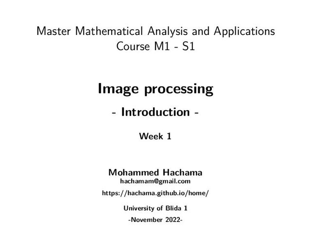 pixels Voisinage d’un pixel • 4 horizontaux et verticaux (x + 1, y), (x − 1, y), (x, y + 1), (x, y − 1) • 4 diagonaux (x + 1, y + 1), (x + 1, y − 1), (x − 1, y + 1), (x − 1, y − 1) • Ces 8 pixels • Certains peuvent ˆ etre hors image ! Image processing (week 1) -Introduction- (8/22) M. Hachama (
