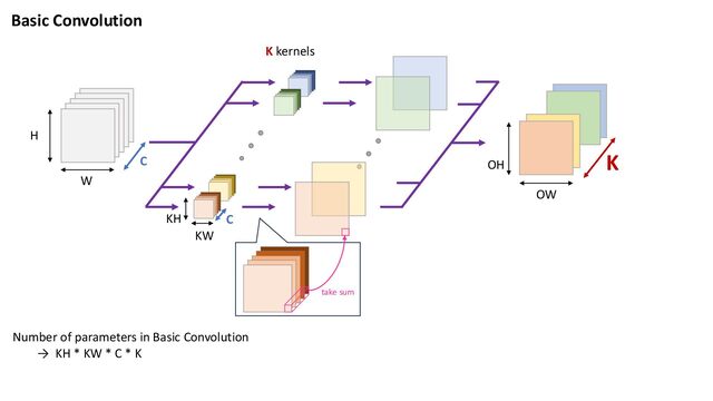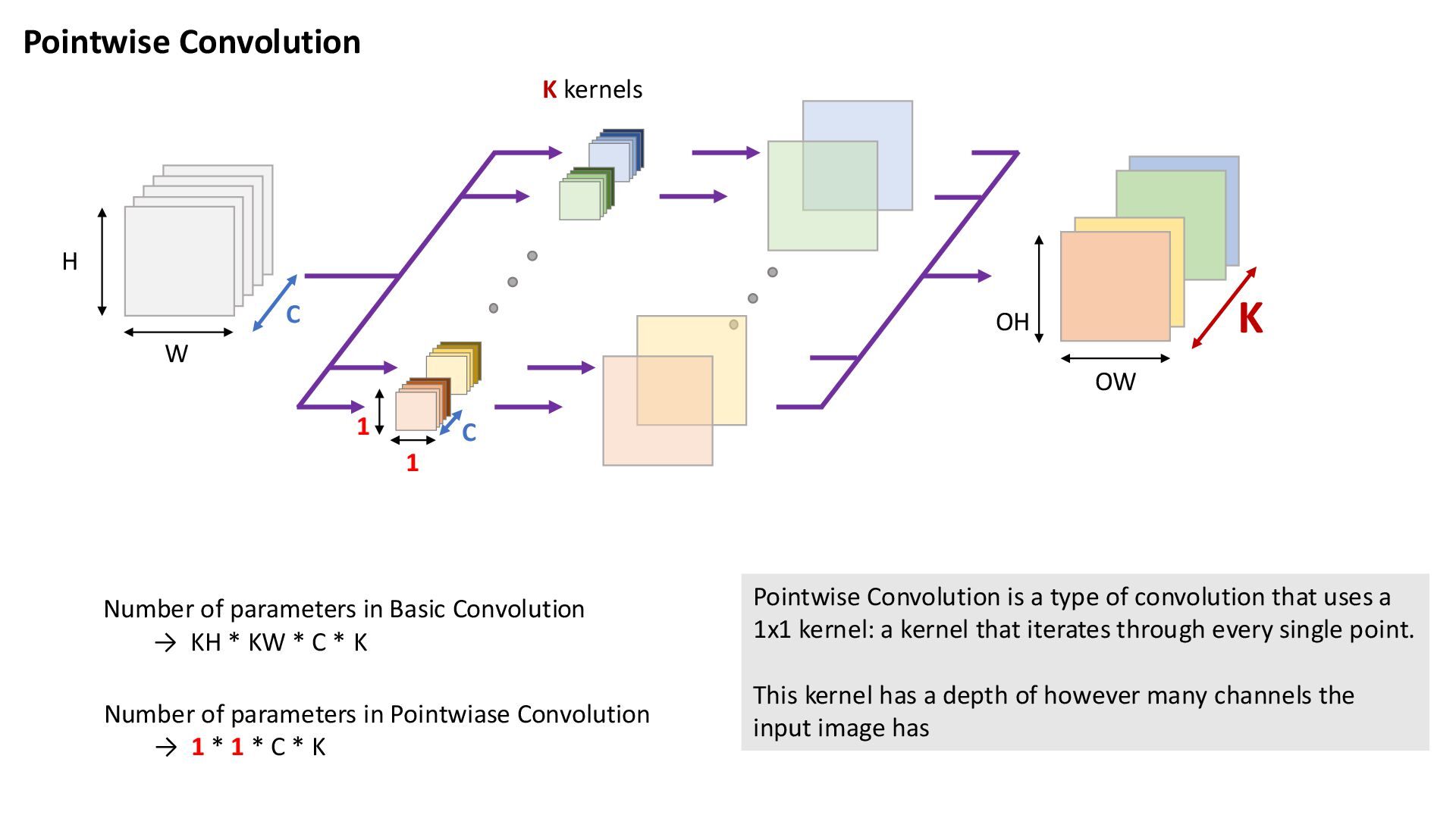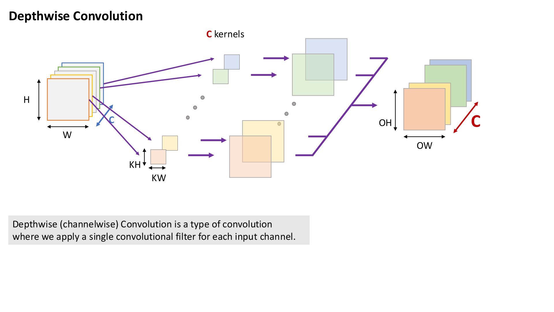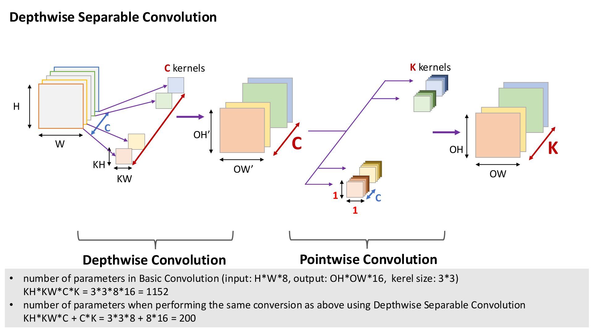 Depthwise Separable Convolution • number of parameters in Basic Convolution (input: H*W*8, output: OH*OW*16, kerel size: 3*3) KH*KW*C*K = 3*3*8*16 = 1152 • number of parameters when performing the same conversion as above using Depthwise Separable Convolution KH*KW*C + C*K = 3*3*8 + 8*16 = 200 K kernels 1 1 C K OW OH Pointwise Convolution Depthwise Convolution