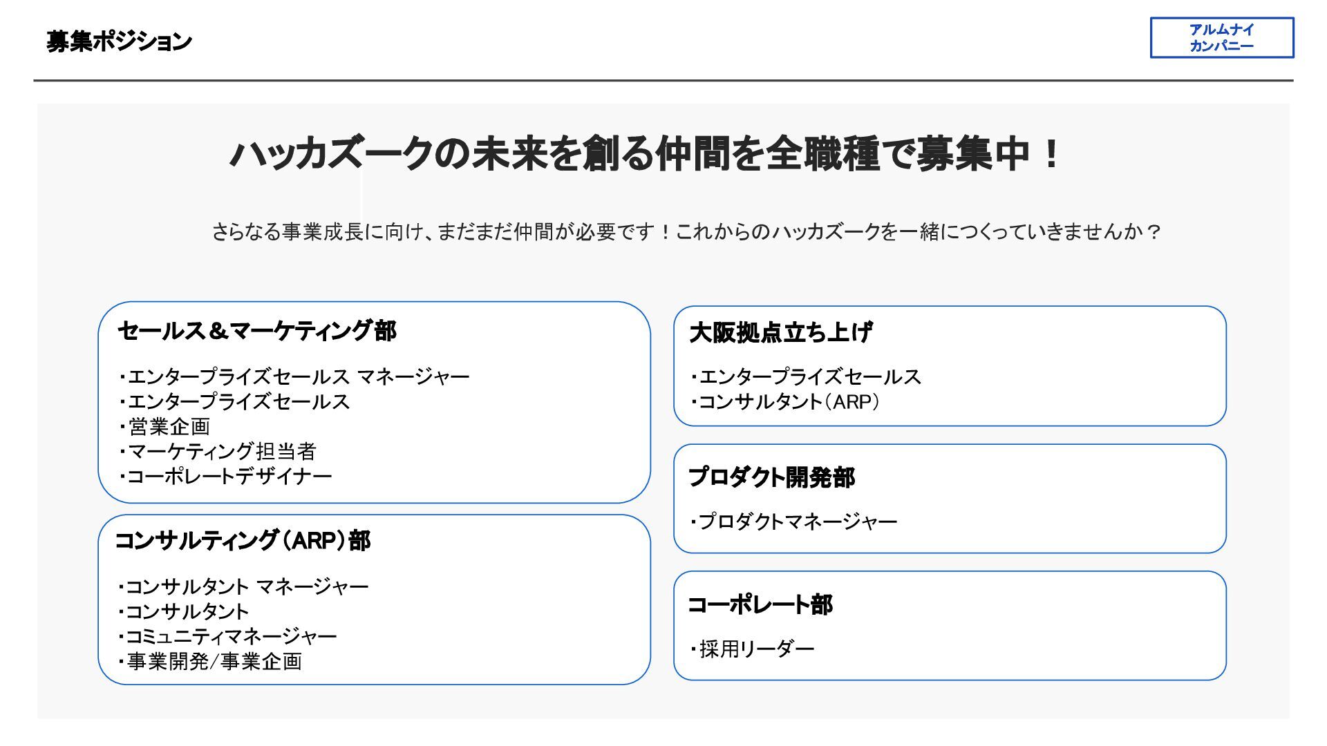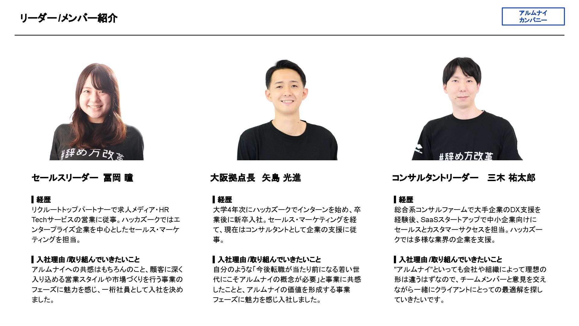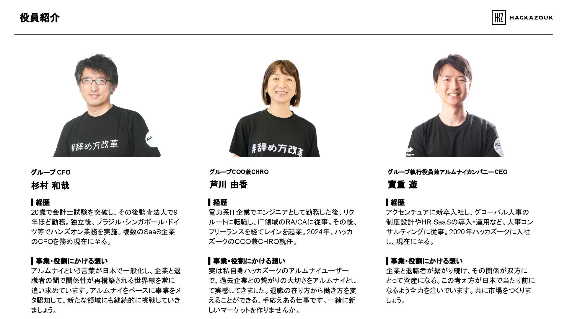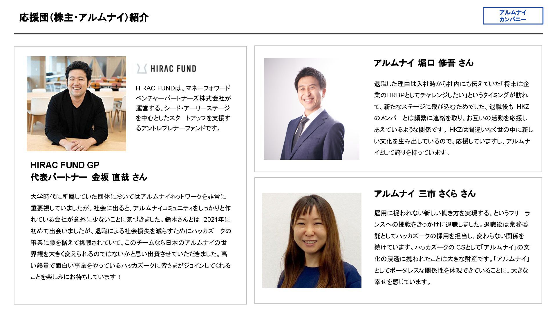 HIRAC FUNDは、マネーフォワード ベンチャーパートナーズ株式会社が 運営する、シード・アーリーステージ を中心としたスタートアップを支援す るアントレプレナーファンドです。 大学時代に所属していた団体においてはアルムナイネットワークを非常に 重要視していましたが、社会に出ると、アルムナイコミュニティをしっかりと作 れている会社が意外に少ないことに気づきました。鈴木さんとは 2021年に 初めて出会いましたが、退職による社会損失を減らすためにハッカズークの 事業に腰を据えて挑戦されていて、このチームなら日本のアルムナイの世 界観を大きく変えられるのではないかと思い出資させていただきました。高 い熱量で面白い事業をやっているハッカズークに皆さまがジョインしてくれる ことを楽しみにお待ちしています! アルムナイ 堀口 修吾 さん 退職した理由は入社時から社内にも伝えていた「将来は企 業のHRBPとしてチャレンジしたい」というタイミングが訪れ て、新たなステージに飛び込むためでした。退職後も HKZ のメンバーとは頻繁に連絡を取り、お互いの活動を応援し あえているような関係です。 HKZは間違いなく世の中に新し い文化を生み出しているので、応援していますし、アルムナ イとして誇りを持っています。 アルムナイ 三市 さくら さん 雇用に捉われない新しい働き方を実現する、というフリーラ ンスへの挑戦をきっかけに退職しました。退職後は業務委 託としてハッカズークの採用を担当し、変わらない関係を 続けています。ハッカズークの CSとして「アルムナイ」の文 化の浸透に携われたことは大きな財産です。「アルムナイ」 としてボーダレスな関係性を体現できていることに、大きな 幸せを感じています。
