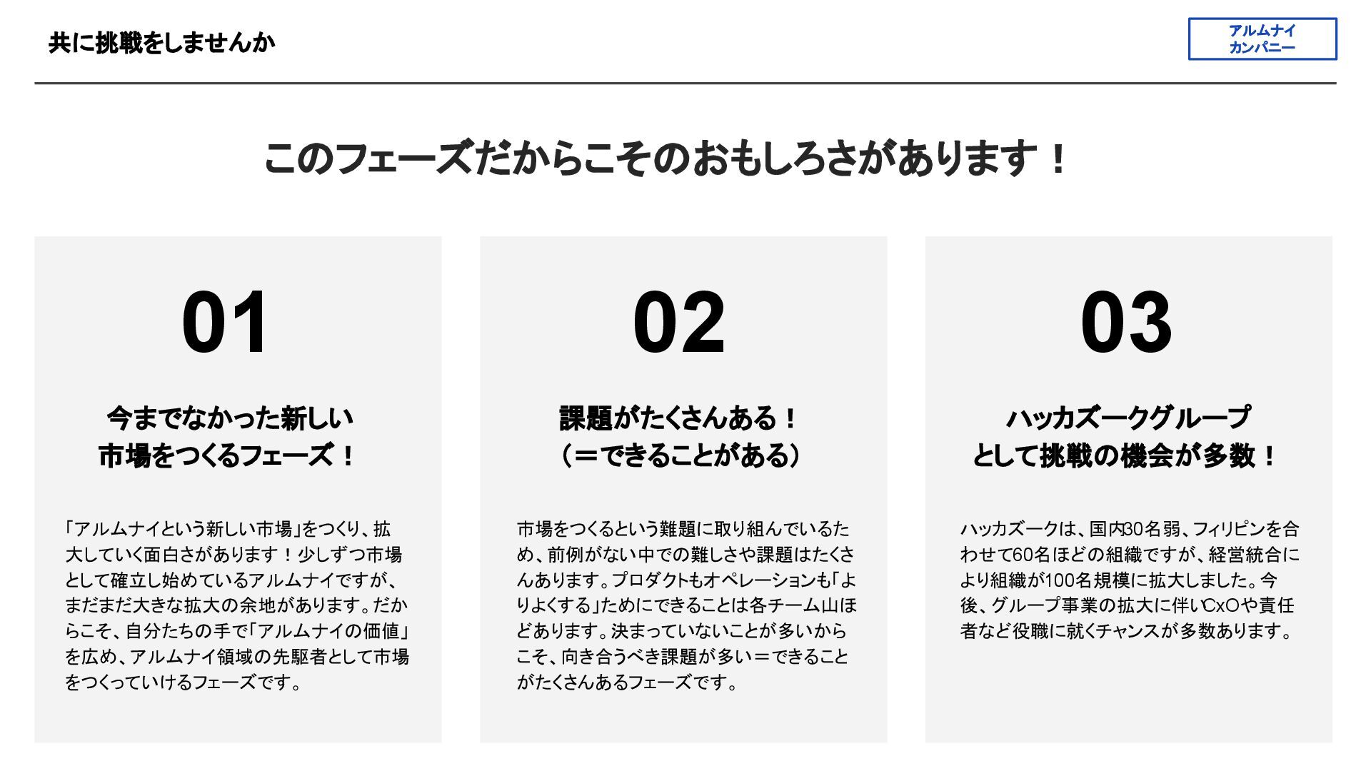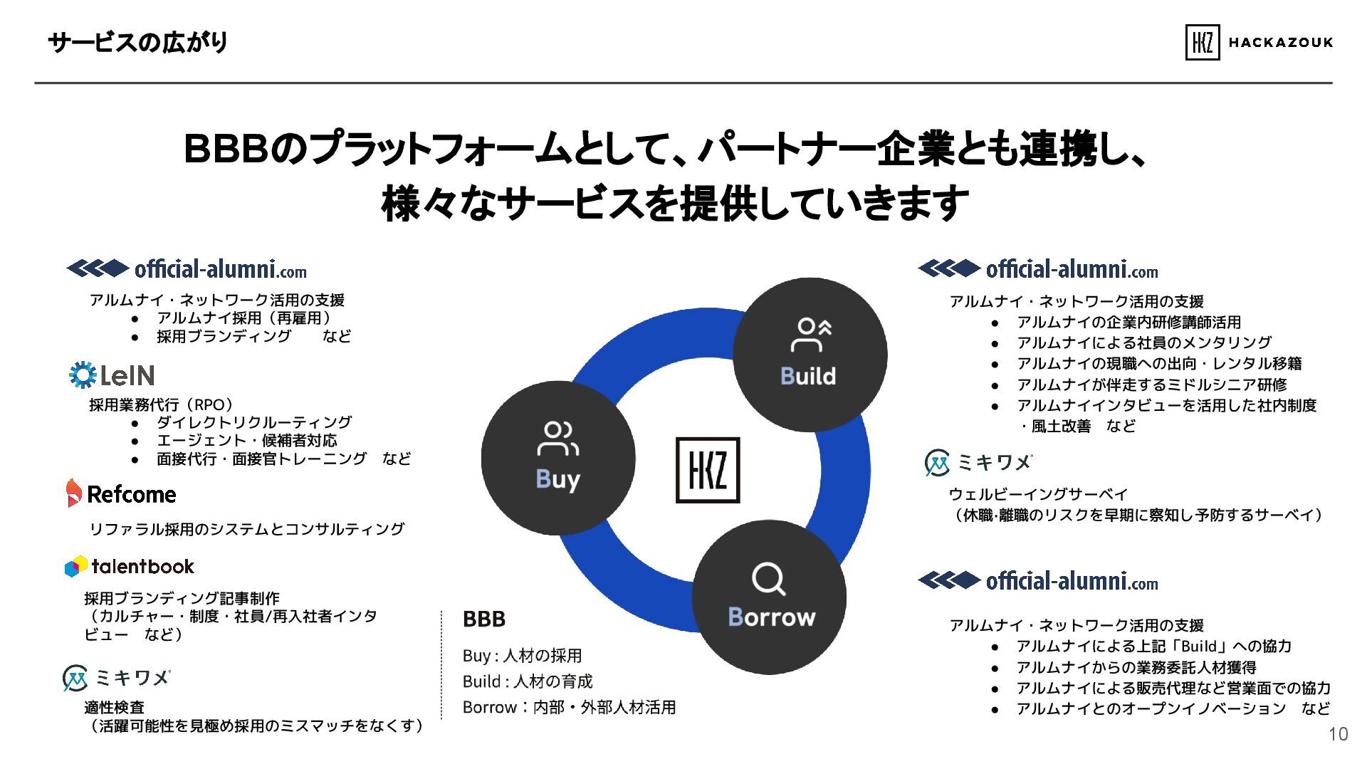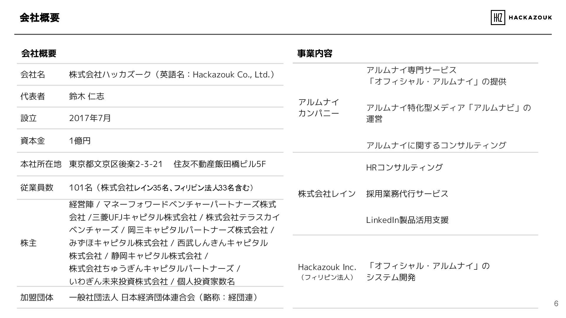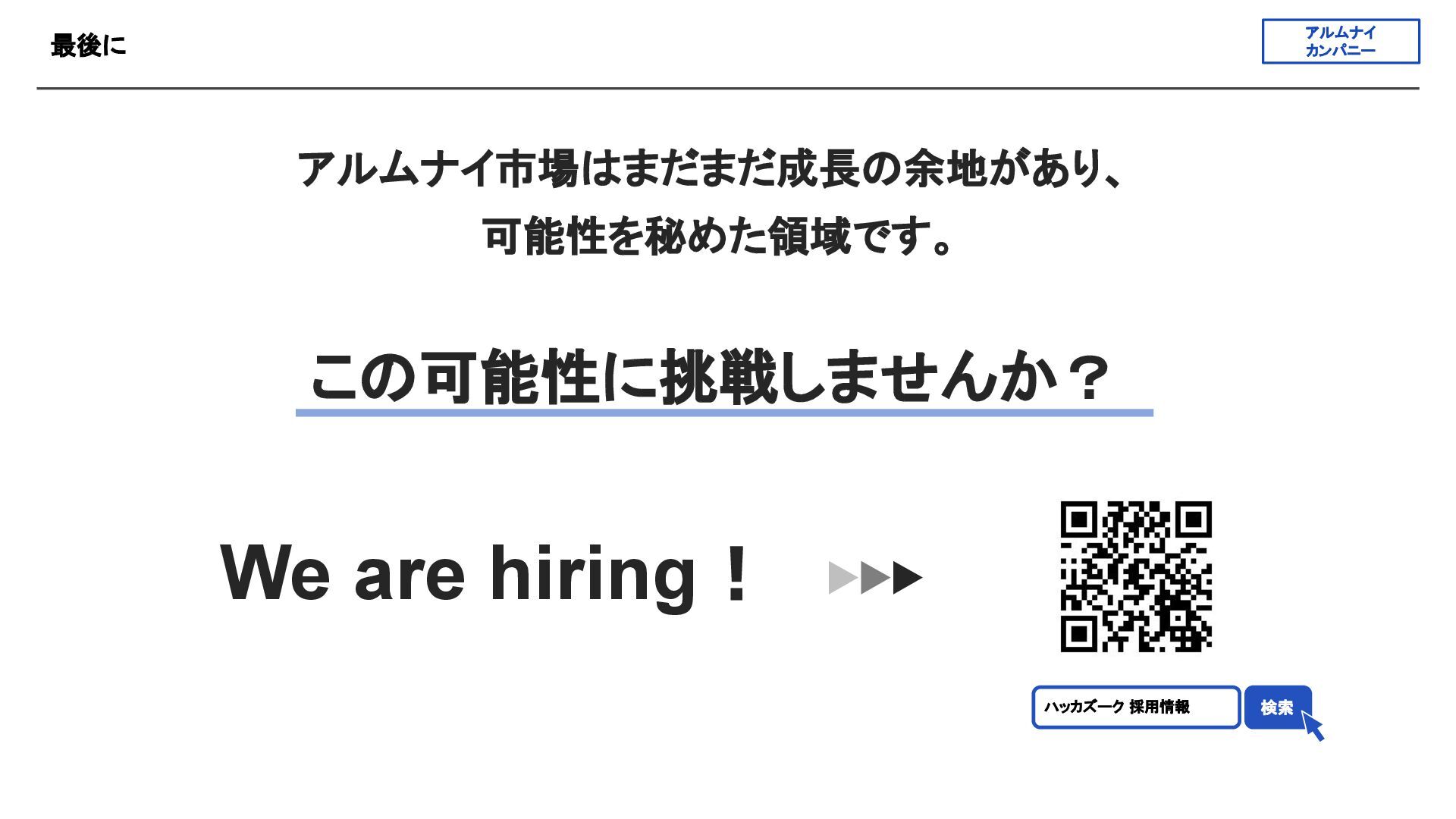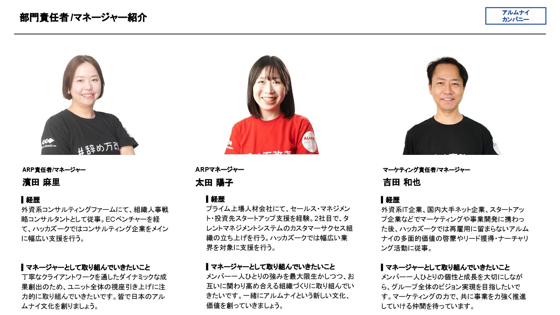 HIRAC FUNDは、マネーフォワード ベンチャーパートナーズ株式会社が 運営する、シード・アーリーステージ を中心としたスタートアップを支援す るアントレプレナーファンドです。 大学時代に所属していた団体においてはアルムナイネットワークを非常に 重要視していましたが、社会に出ると、アルムナイコミュニティをしっかりと作 れている会社が意外に少ないことに気づきました。鈴木さんとは 2021年に 初めて出会いましたが、退職による社会損失を減らすためにハッカズークの 事業に腰を据えて挑戦されていて、このチームなら日本のアルムナイの世 界観を大きく変えられるのではないかと思い出資させていただきました。高 い熱量で面白い事業をやっているハッカズークに皆さまがジョインしてくれる ことを楽しみにお待ちしています! アルムナイ 堀口 修吾 さん 退職した理由は入社時から社内にも伝えていた「将来は企 業のHRBPとしてチャレンジしたい」というタイミングが訪れ て、新たなステージに飛び込むためでした。退職後も HKZ のメンバーとは頻繁に連絡を取り、お互いの活動を応援し あえているような関係です。 HKZは間違いなく世の中に新し い文化を生み出しているので、応援していますし、アルムナ イとして誇りを持っています。 アルムナイ 三市 さくら さん 雇用に捉われない新しい働き方を実現する、というフリーラ ンスへの挑戦をきっかけに退職しました。退職後は業務委 託としてハッカズークの採用を担当し、変わらない関係を 続けています。ハッカズークの CSとして「アルムナイ」の文 化の浸透に携われたことは大きな財産です。「アルムナイ」 としてボーダレスな関係性を体現できていることに、大きな 幸せを感じています。