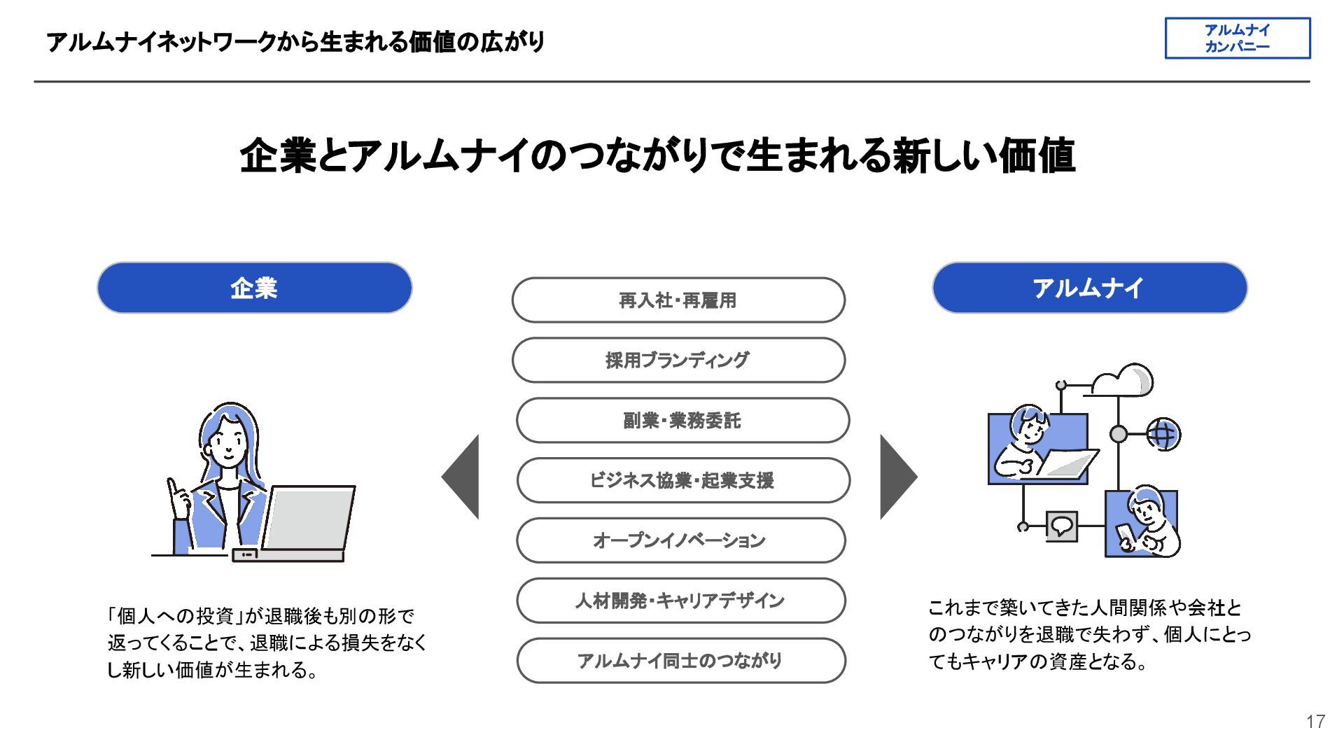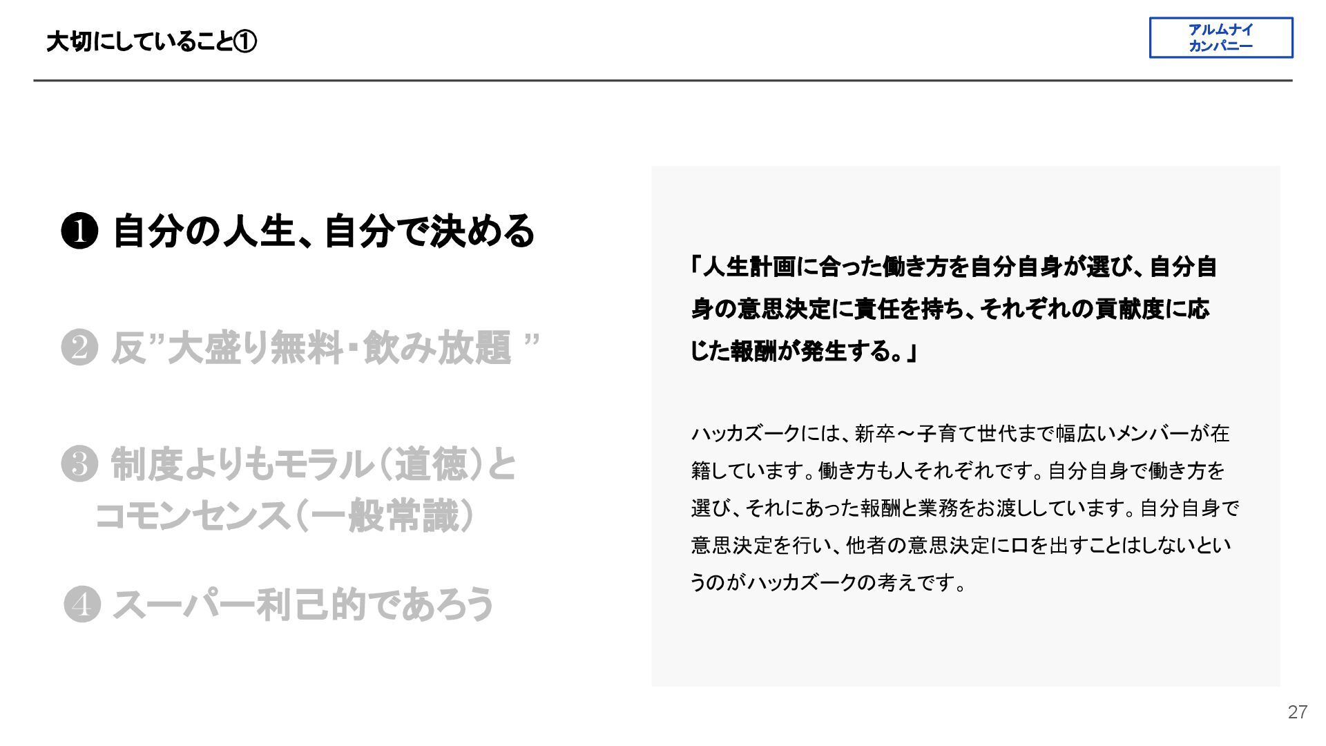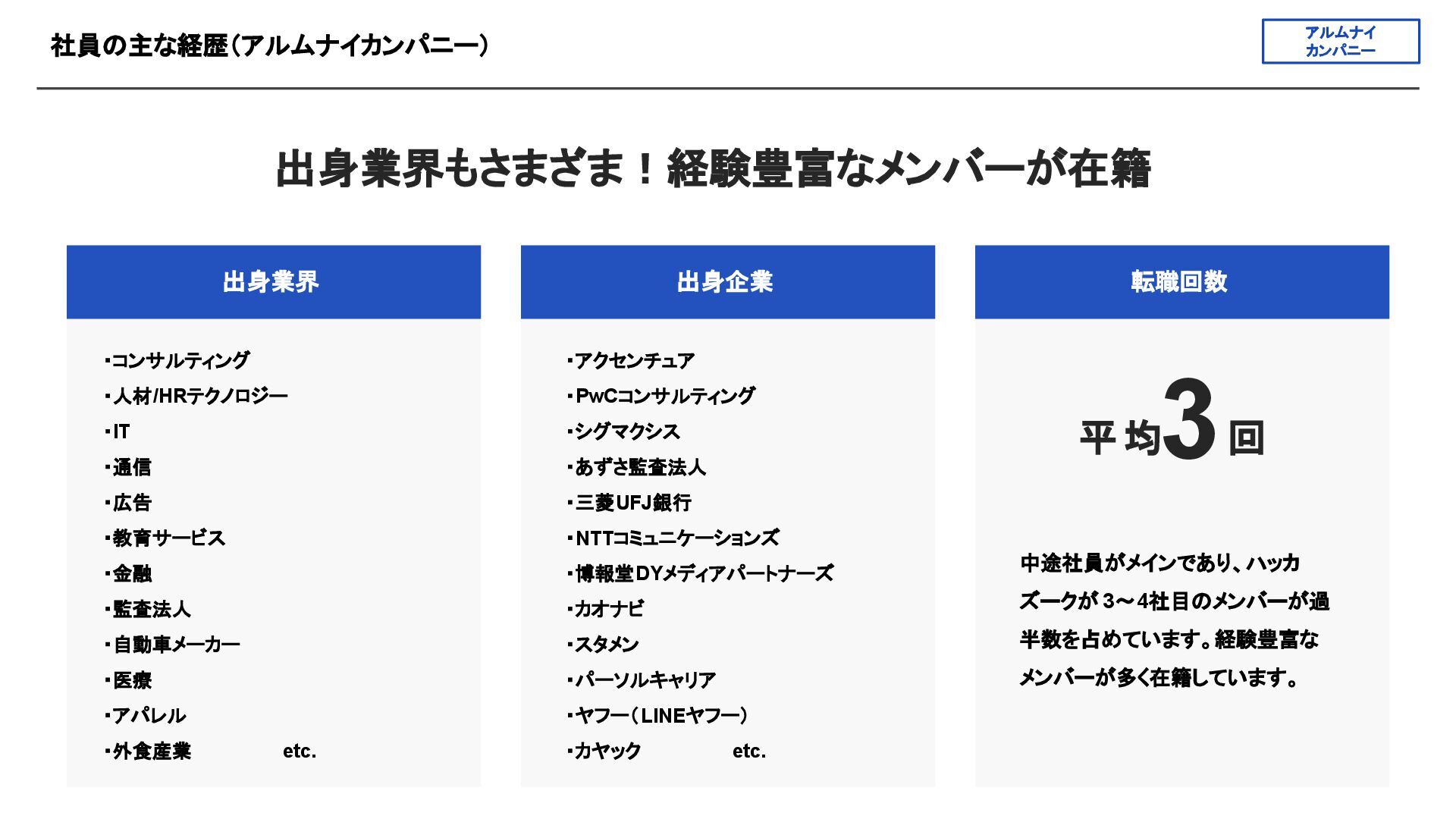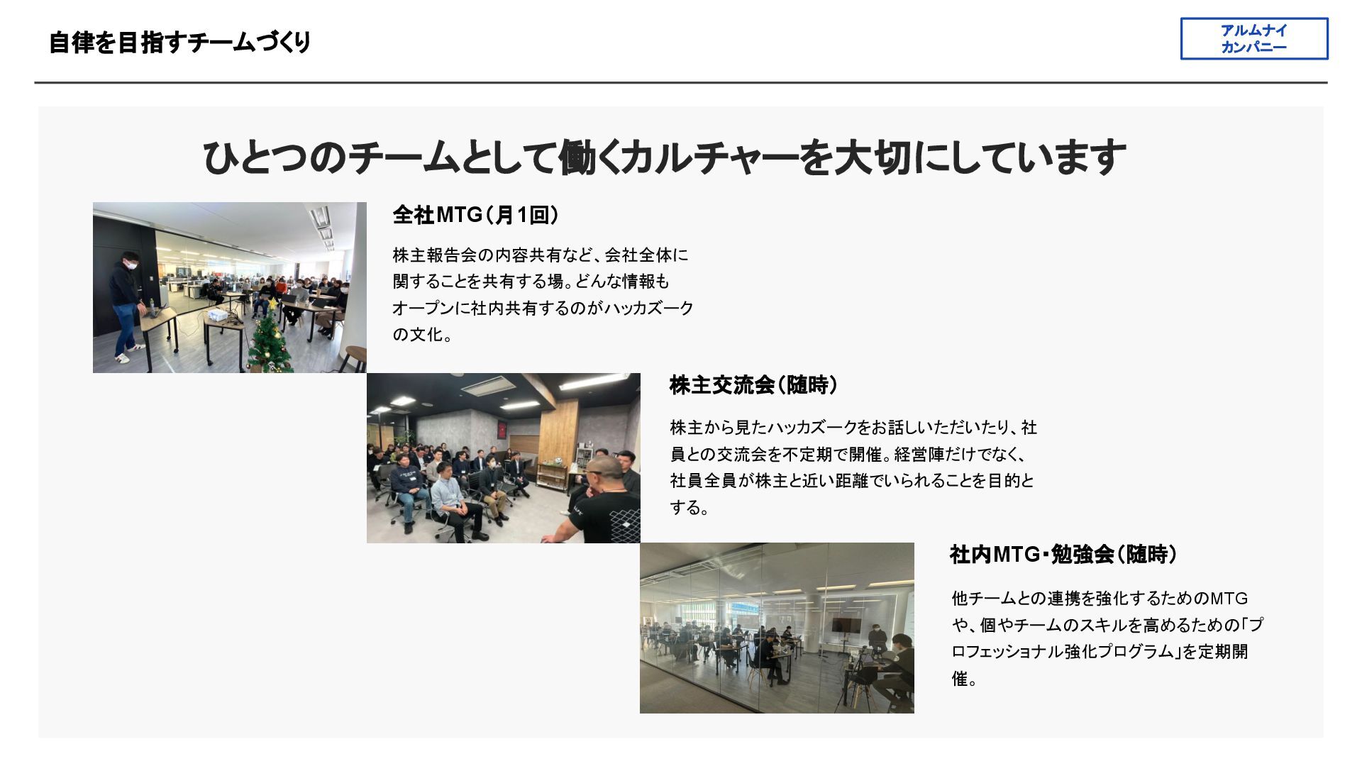 HIRAC FUNDは、マネーフォワード ベンチャーパートナーズ株式会社が 運営する、シード・アーリーステージ を中心としたスタートアップを支援す るアントレプレナーファンドです。 大学時代に所属していた団体においてはアルムナイネットワークを非常に 重要視していましたが、社会に出ると、アルムナイコミュニティをしっかりと作 れている会社が意外に少ないことに気づきました。鈴木さんとは 2021年に 初めて出会いましたが、退職による社会損失を減らすためにハッカズークの 事業に腰を据えて挑戦されていて、このチームなら日本のアルムナイの世 界観を大きく変えられるのではないかと思い出資させていただきました。高 い熱量で面白い事業をやっているハッカズークに皆さまがジョインしてくれる ことを楽しみにお待ちしています! アルムナイ 堀口 修吾 さん 退職した理由は入社時から社内にも伝えていた「将来は企 業のHRBPとしてチャレンジしたい」というタイミングが訪れ て、新たなステージに飛び込むためでした。退職後も HKZ のメンバーとは頻繁に連絡を取り、お互いの活動を応援し あえているような関係です。 HKZは間違いなく世の中に新し い文化を生み出しているので、応援していますし、アルムナ イとして誇りを持っています。 アルムナイ 三市 さくら さん 雇用に捉われない新しい働き方を実現する、というフリーラ ンスへの挑戦をきっかけに退職しました。退職後は業務委 託としてハッカズークの採用を担当し、変わらない関係を 続けています。ハッカズークの CSとして「アルムナイ」の文 化の浸透に携われたことは大きな財産です。「アルムナイ」 としてボーダレスな関係性を体現できていることに、大きな 幸せを感じています。