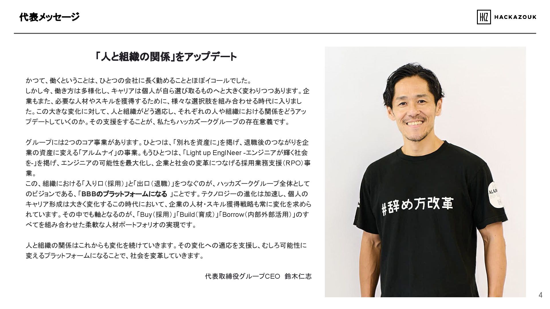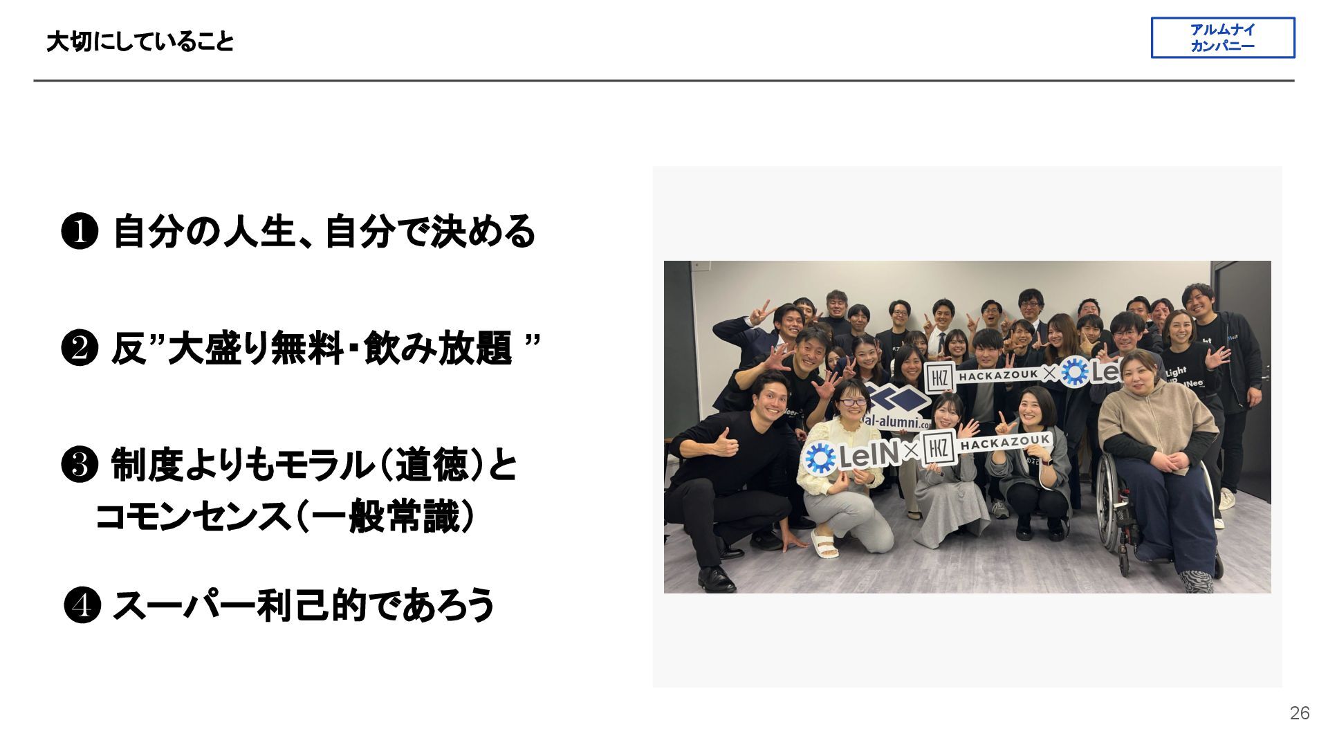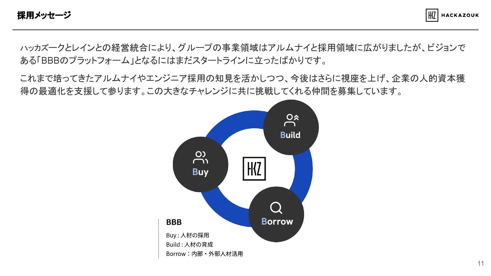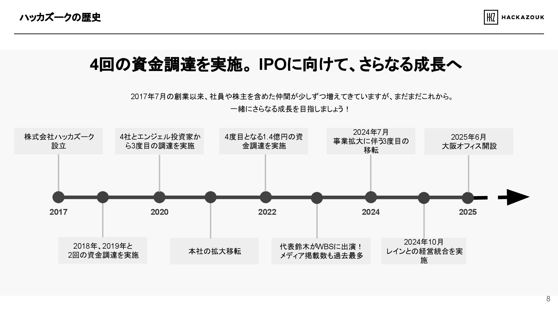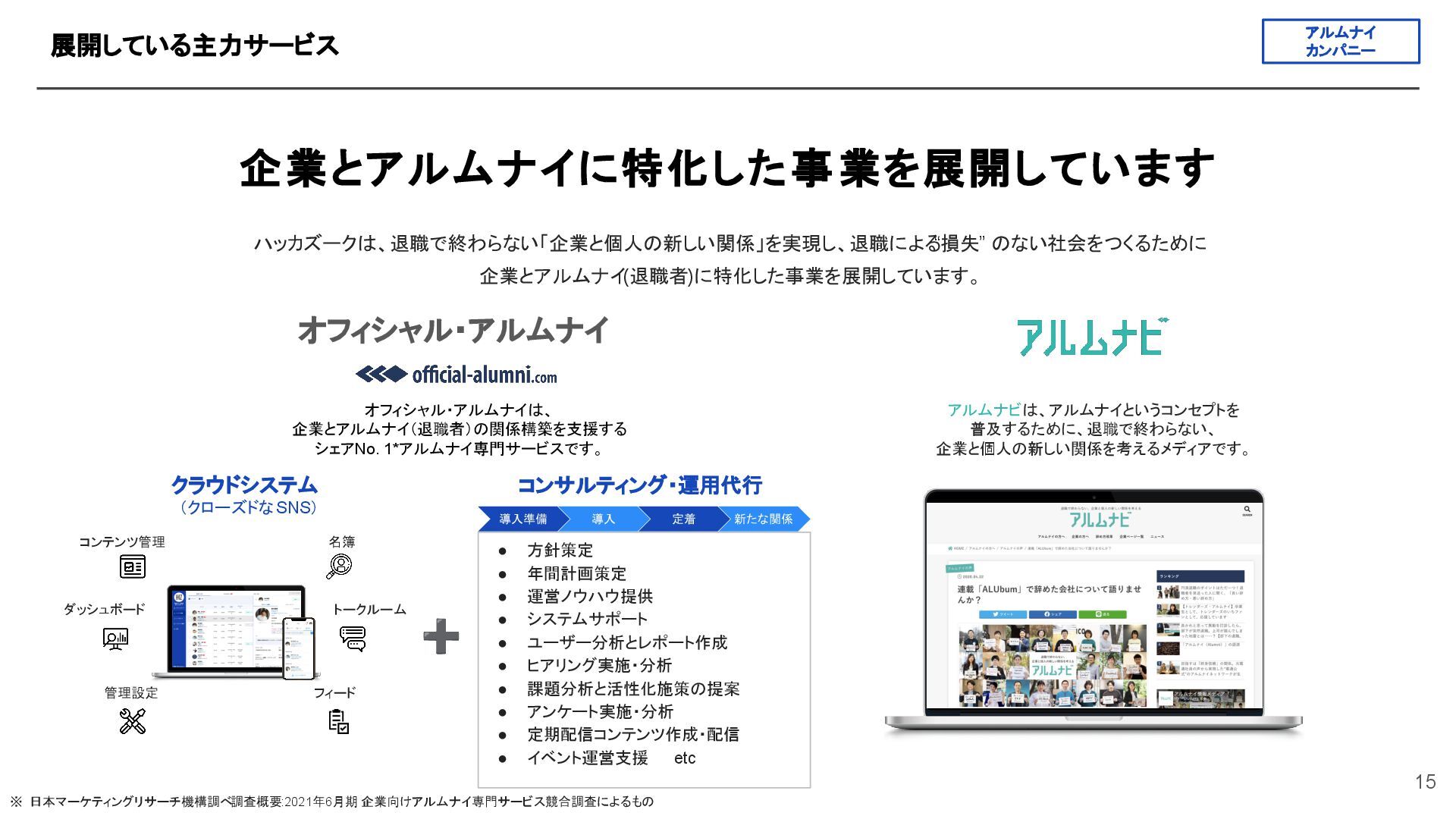 HIRAC FUNDは、マネーフォワード ベンチャーパートナーズ株式会社が 運営する、シード・アーリーステージ を中心としたスタートアップを支援す るアントレプレナーファンドです。 大学時代に所属していた団体においてはアルムナイネットワークを非常に 重要視していましたが、社会に出ると、アルムナイコミュニティをしっかりと作 れている会社が意外に少ないことに気づきました。鈴木さんとは 2021年に 初めて出会いましたが、退職による社会損失を減らすためにハッカズークの 事業に腰を据えて挑戦されていて、このチームなら日本のアルムナイの世 界観を大きく変えられるのではないかと思い出資させていただきました。高 い熱量で面白い事業をやっているハッカズークに皆さまがジョインしてくれる ことを楽しみにお待ちしています! アルムナイ 堀口 修吾 さん 退職した理由は入社時から社内にも伝えていた「将来は企 業のHRBPとしてチャレンジしたい」というタイミングが訪れ て、新たなステージに飛び込むためでした。退職後も HKZ のメンバーとは頻繁に連絡を取り、お互いの活動を応援し あえているような関係です。 HKZは間違いなく世の中に新し い文化を生み出しているので、応援していますし、アルムナ イとして誇りを持っています。 アルムナイ 三市 さくら さん 雇用に捉われない新しい働き方を実現する、というフリーラ ンスへの挑戦をきっかけに退職しました。退職後は業務委 託としてハッカズークの採用を担当し、変わらない関係を 続けています。ハッカズークの CSとして「アルムナイ」の文 化の浸透に携われたことは大きな財産です。「アルムナイ」 としてボーダレスな関係性を体現できていることに、大きな 幸せを感じています。