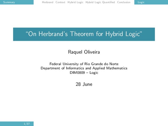 Hybrid Satisfaction Hybrid satisfaction between a hybrid structure, a world assignment, a state and a hybrid formula is recursively defined by: 1 H, g, w t iff w = g(t), for t ∈ Term(Σ, WVar) 2 H, g, w p iff w ∈ V (p), for p ∈ Prop 3 H, g, w ¬ϕ iff not H, g, w ϕ 4 H, g, w ϕ1 ∧ ϕ2 iff H, g, w ϕ1 and H, g, w ϕ2 5 H, g, w ♦ϕ iff ∃w ∈ W (wRw ) and H, g, w ϕ 6 H, g, w @i ϕ iff H, g, w ϕ, where w = g(t), for t ∈ Term(Σ, WVar) 7 H, g, w ∀sϕ iff H, g , w ϕ for all g such that g s ∼ g 8 H, g, w ∃sϕ iff H, g , w ϕ for some g such that g s ∼ g H, g, w ϕ means that ϕ is satisfied in M under the world assignment g at the state w. 25/37