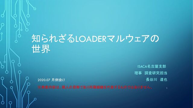 知られざるLOADERマルウェアの 世界 ISACA名古屋支部 理事 調査研究担当 長谷川 達也 2020.07 月例会LT ※発表内容は、個人の見解であり所属組織を代表するものではありません。