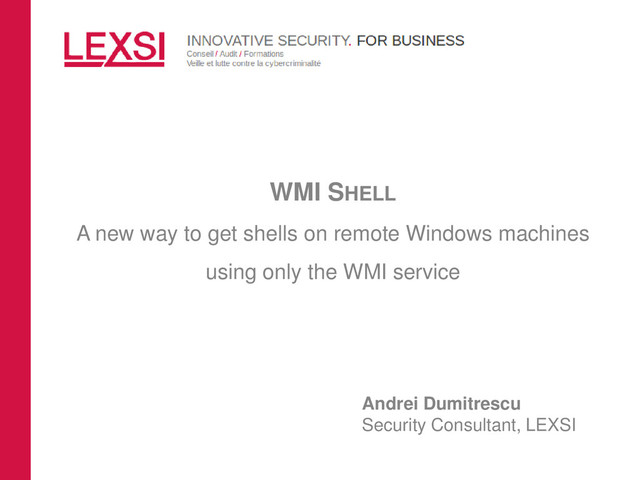 We have developed a tool that allows us to execute commands and get their output using only the WMI infrastructure, without any help from other services, like the SMB server. With the wmi-shell tool we can execute commands, upload files and recover Windows passwords remotely using just the WMI service that listens on port 135. During this talk we will quickly review current authenticated remote code execution methods available for Windows, we will explain the aspects of the WMI architecture that make the wmi-shell possible and we will present the tool itself (demo & links to the source code).