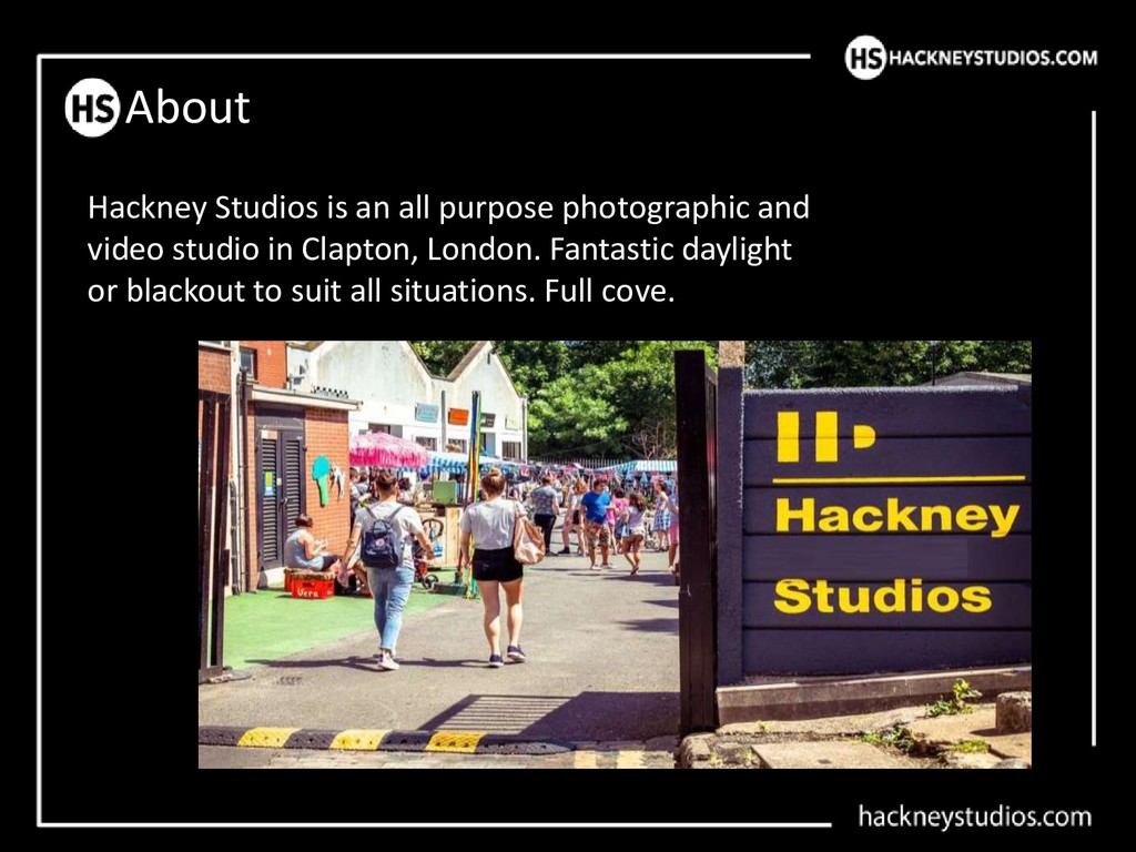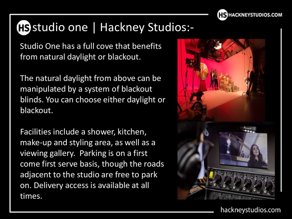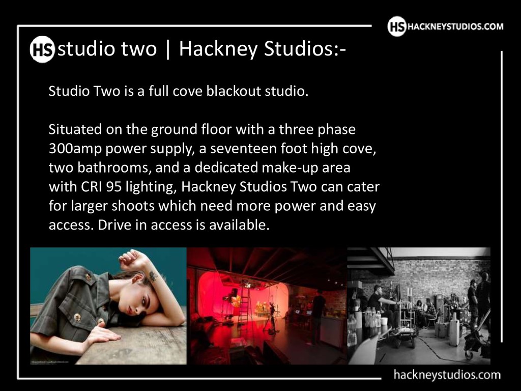 cove blackout studio. Situated on the ground floor with a three phase 300amp power supply, a seventeen foot high cove, two bathrooms, and a dedicated make-up area with CRI 95 lighting, Hackney Studios Two can cater for larger shoots which need more power and easy access. Drive in access is available.
