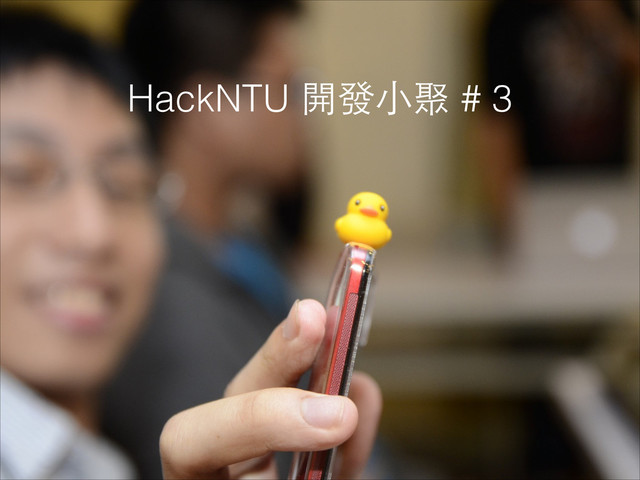 HackNTU 開發⼩小聚 • 每⽉月定期舉辦,延續 Hacker 精神 • 搭起學⽣生與業界的橋樑 • 網⾴頁前端、後端伺服器、⾏行動應⽤用等