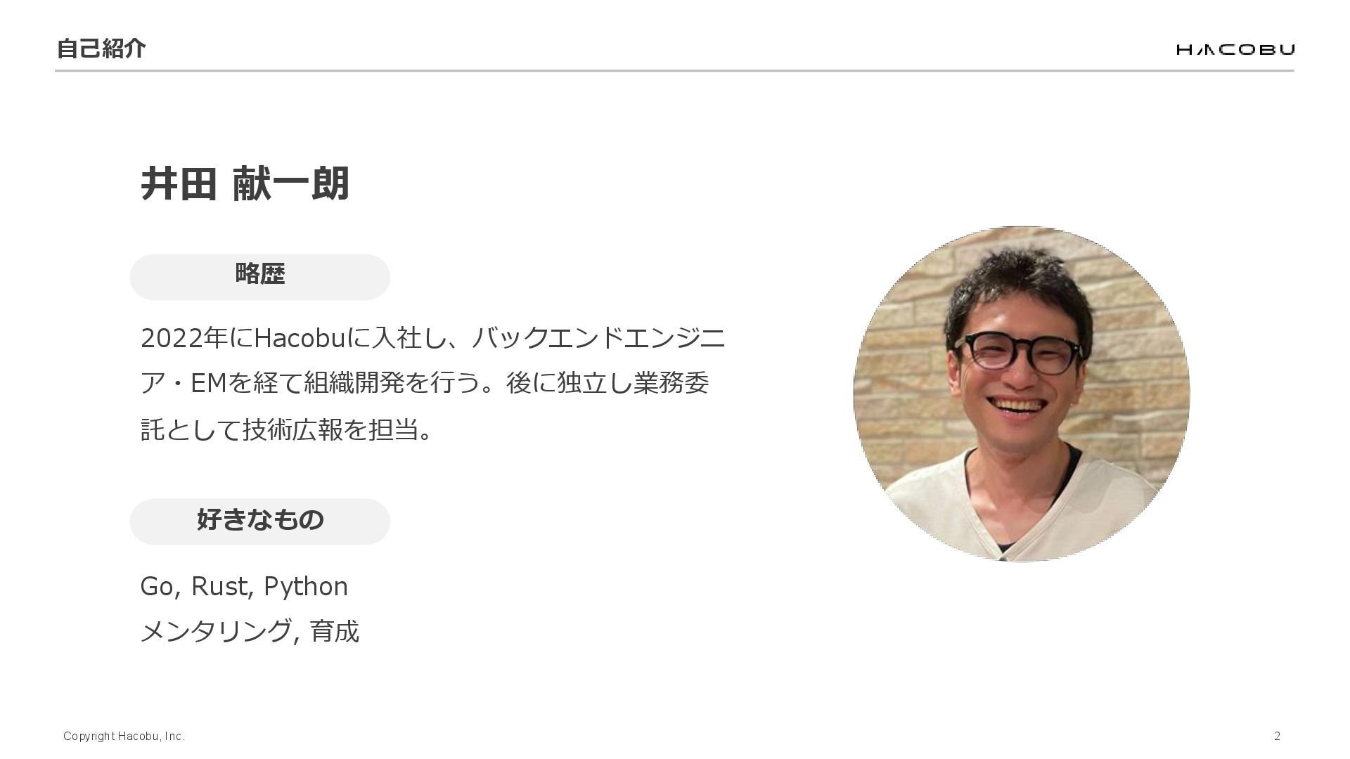 Copyright Hacobu, Inc. 2 自己紹介 Go, Rust, Python メンタリング, 育成