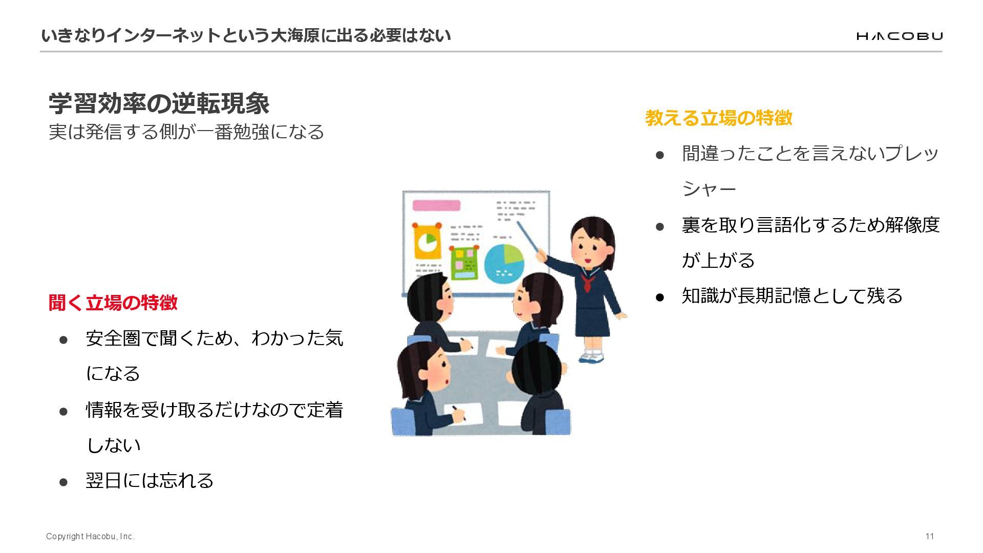 Copyright Hacobu, Inc. 11 いきなりインターネットという大海原に出る必要はない 学習効率の逆転現象 教える立場の特徴 • 間違ったことを言えないプレッ シャー