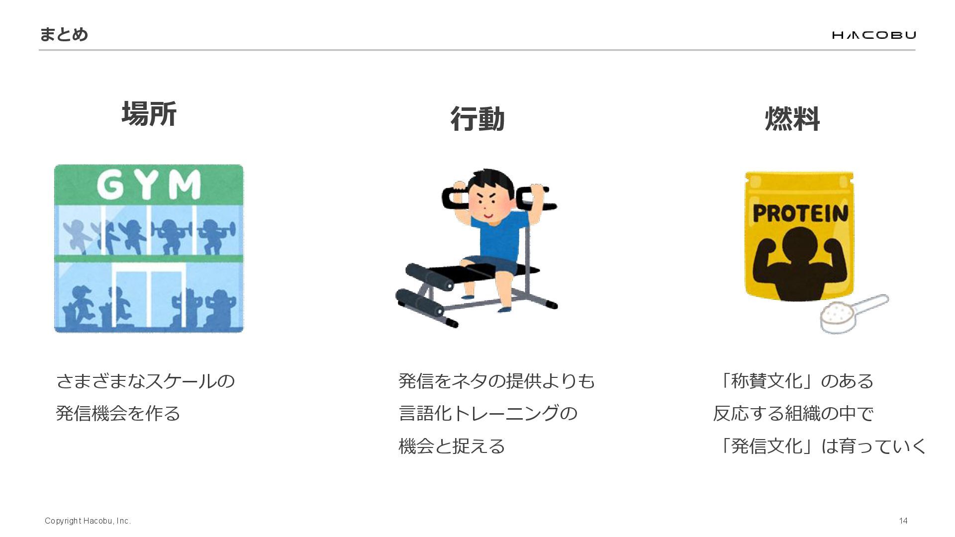 Copyright Hacobu, Inc. 14 まとめ さまざまなスケールの 発信機会を作る 発信をネタの提供よりも 言語化トレーニングの 機会と捉える