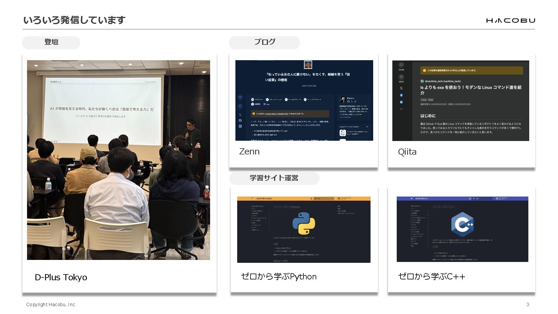 Copyright Hacobu, Inc. 3 いろいろ発信しています D-Plus Tokyo ゼロから学ぶC++ Qiita Zenn