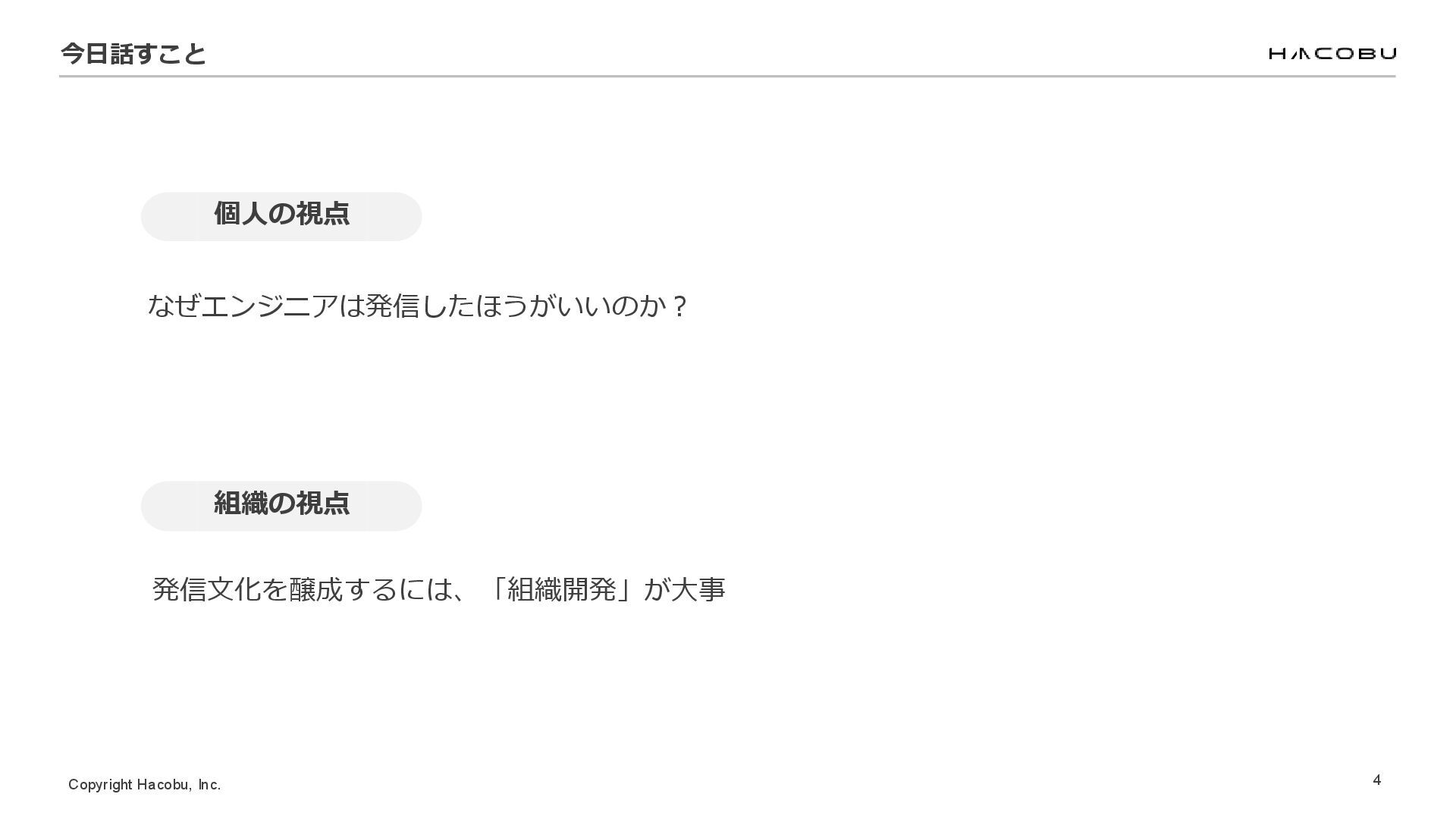 Copyright Hacobu, Inc. 4 今日話すこと 個人の視点 組織の視点 なぜエンジニアは発信したほうがいいのか? 発信文化を醸成するには、「組織開発」が大事